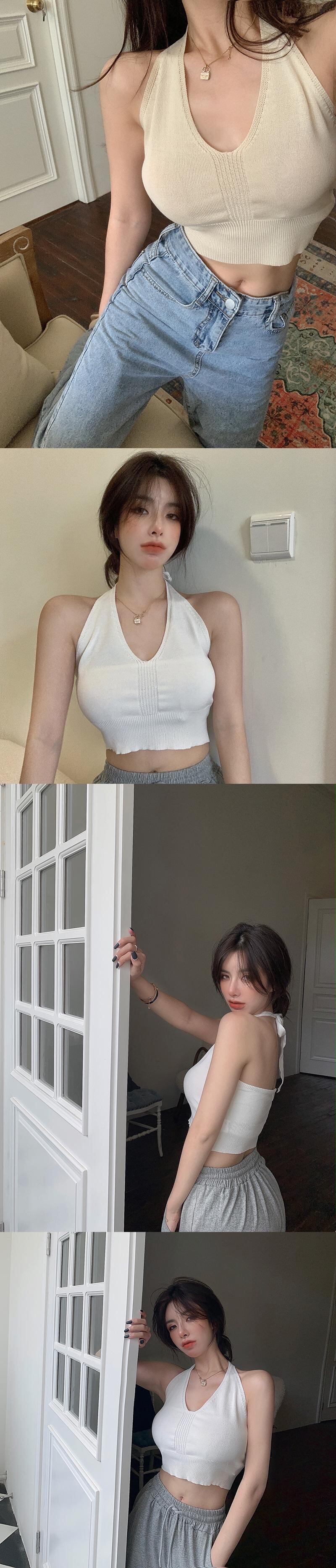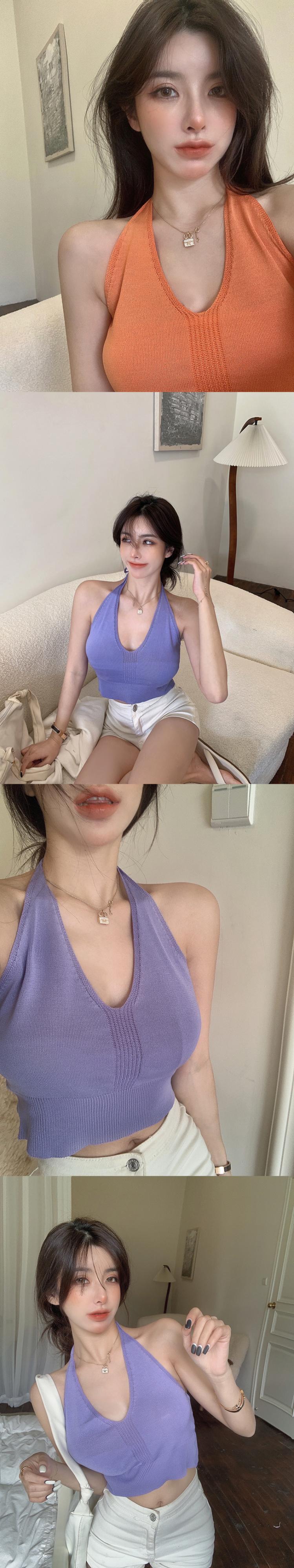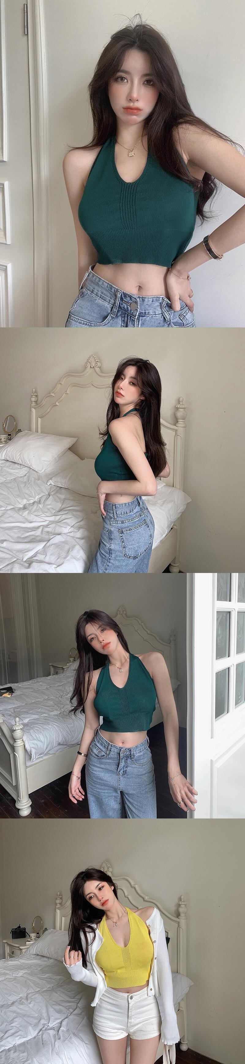 ニットサマーカラーノースリーブVネックレッドショートトップス 夏物 Xiaofeijia24849388291