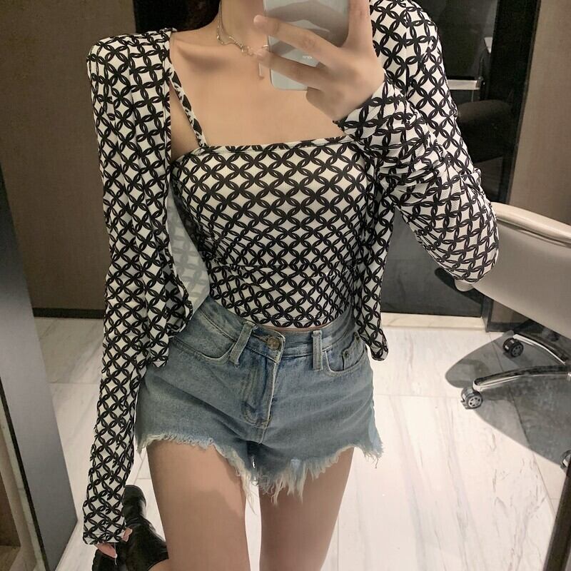 スプリングサマーショートプリント柄ブラックカーディガンジャケット セット ロング 春物 夏物 Xiaofeijia7974046130