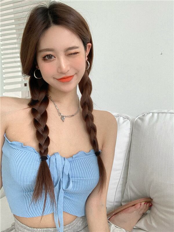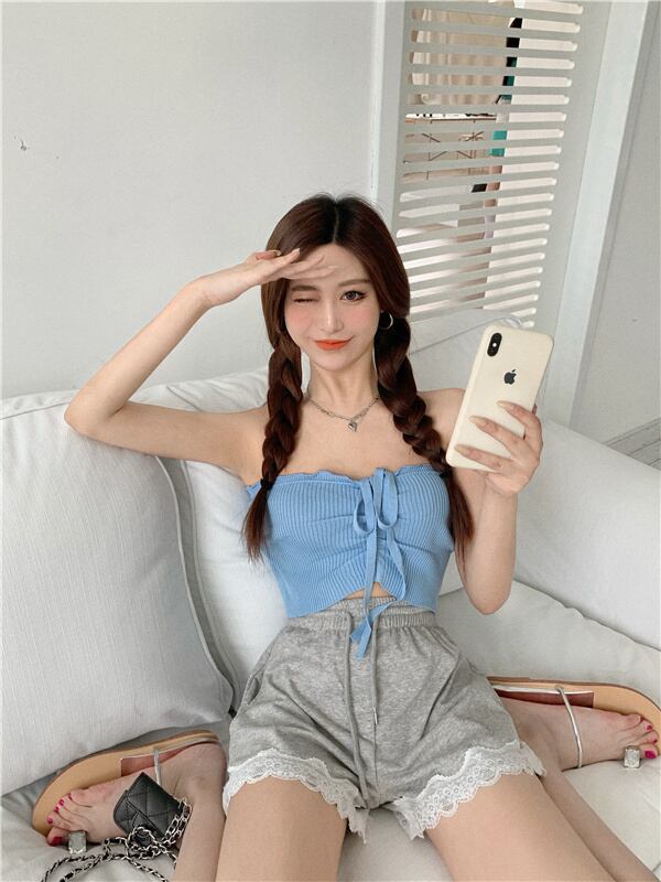サマーソリッド カラーショートレーススリムニットトップス 夏物 レースアップ ソリッドカラー Xiaofeijia87715742801