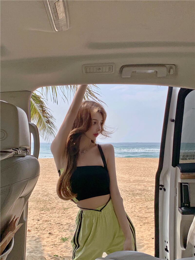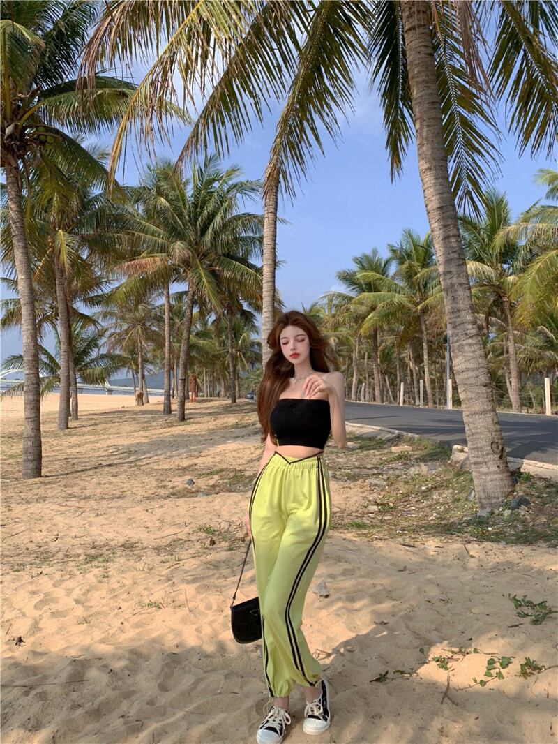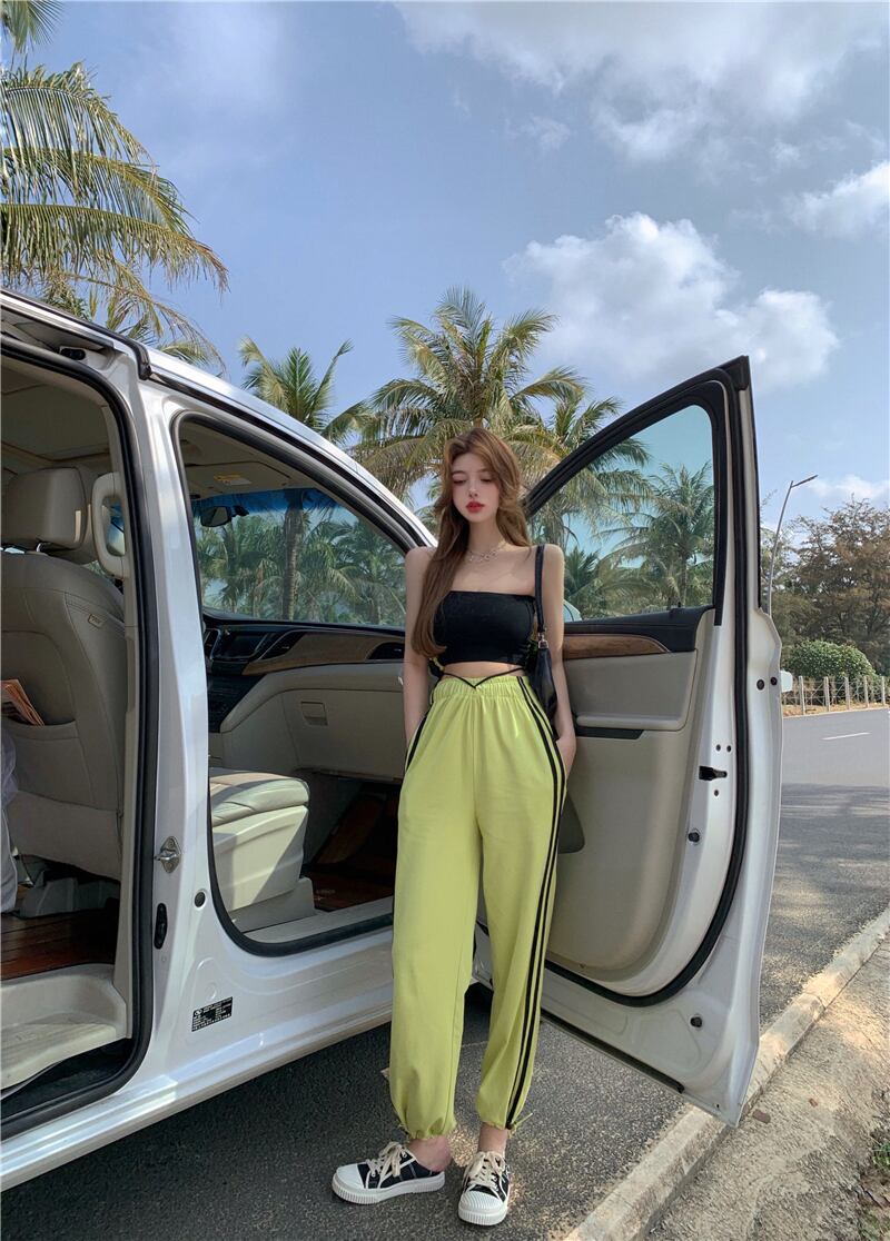 スタイルレッドホワイトイエローストライプストレッチウェストカジュアルパンツ サマーブラックトップス エラスティック 伸縮 夏物 Xiaofeijia12749047555
