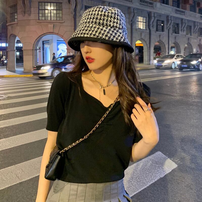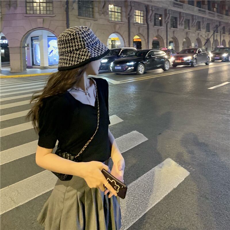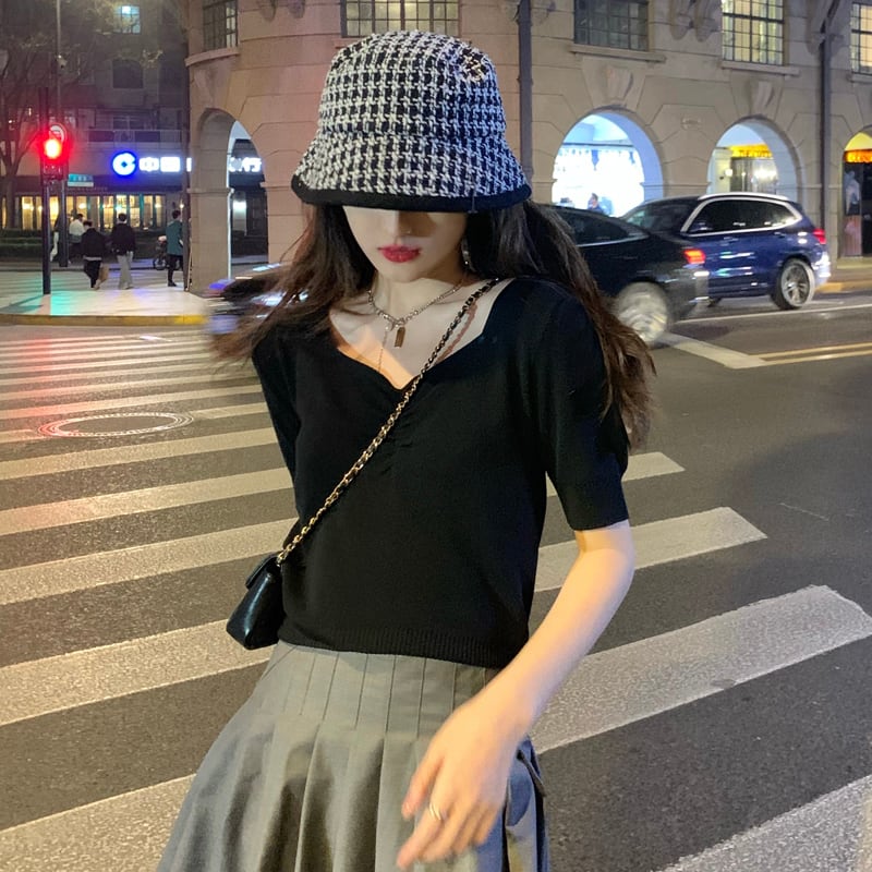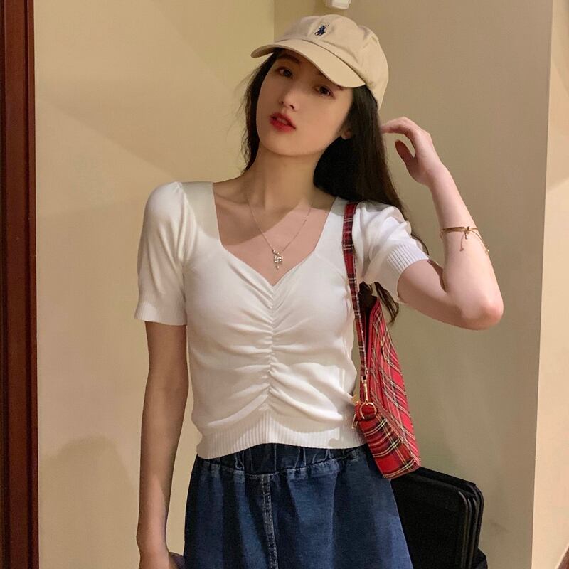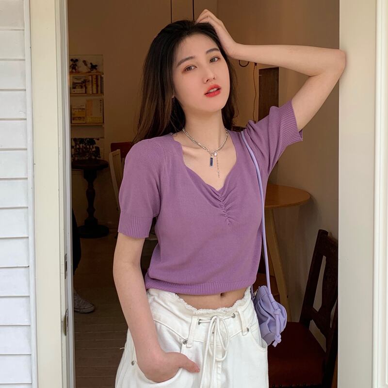 スタンダードホワイトVネックプリーツニットTシャツ トップス レトロ パープル Xiaofeijia45750464172
