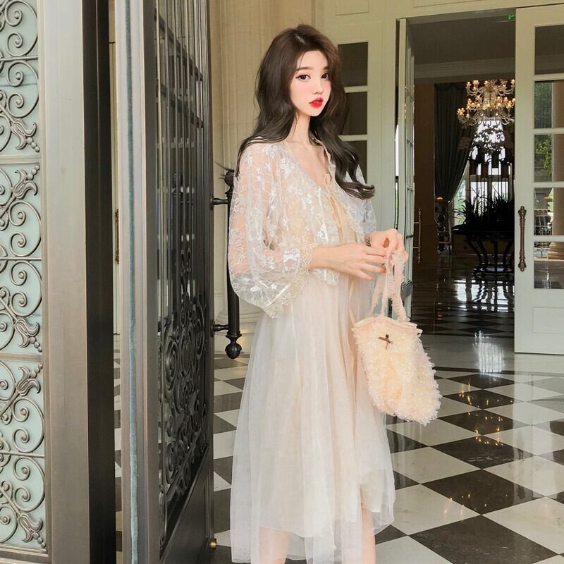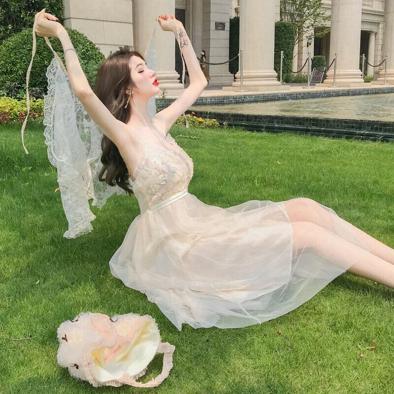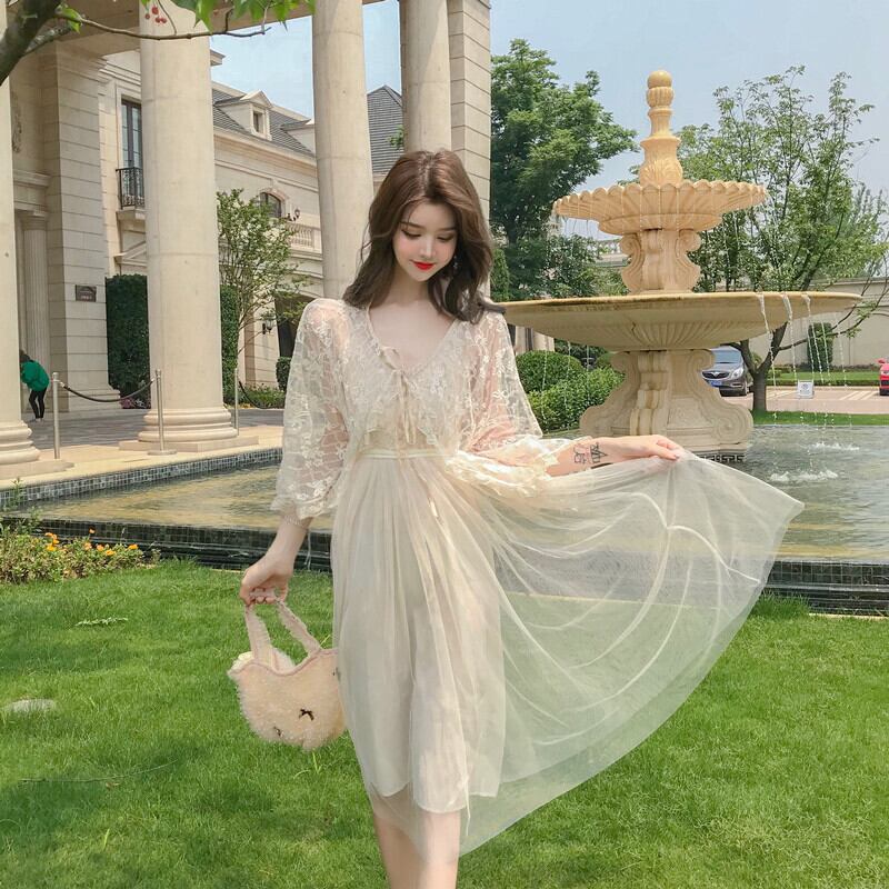 スパンコールドレス Vネックメッシュスカート サマーFlowerデザイン シャツ 夏物 フラワーデザイン Xiaofeijia72816421519
