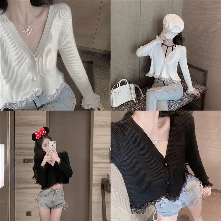 カーディガンニットジャケット Vネックレーススタイルシャツ ショート ロング Xiaofeijia17085551139