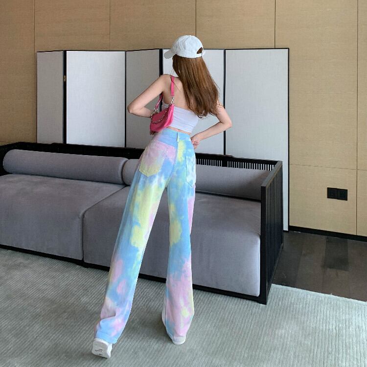 カラージーンズ サマーハイウェストボタンパンツ ルーズ 夏物 アジャスタブル Xiaofeijia45923110655