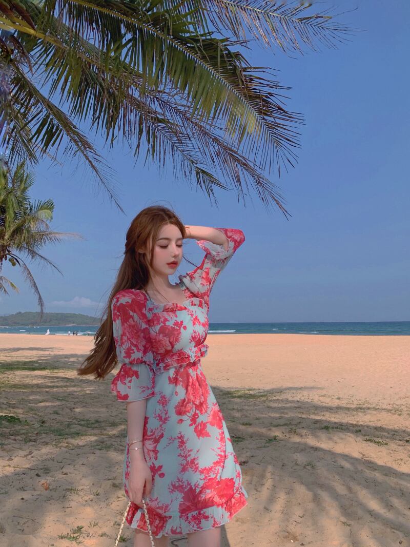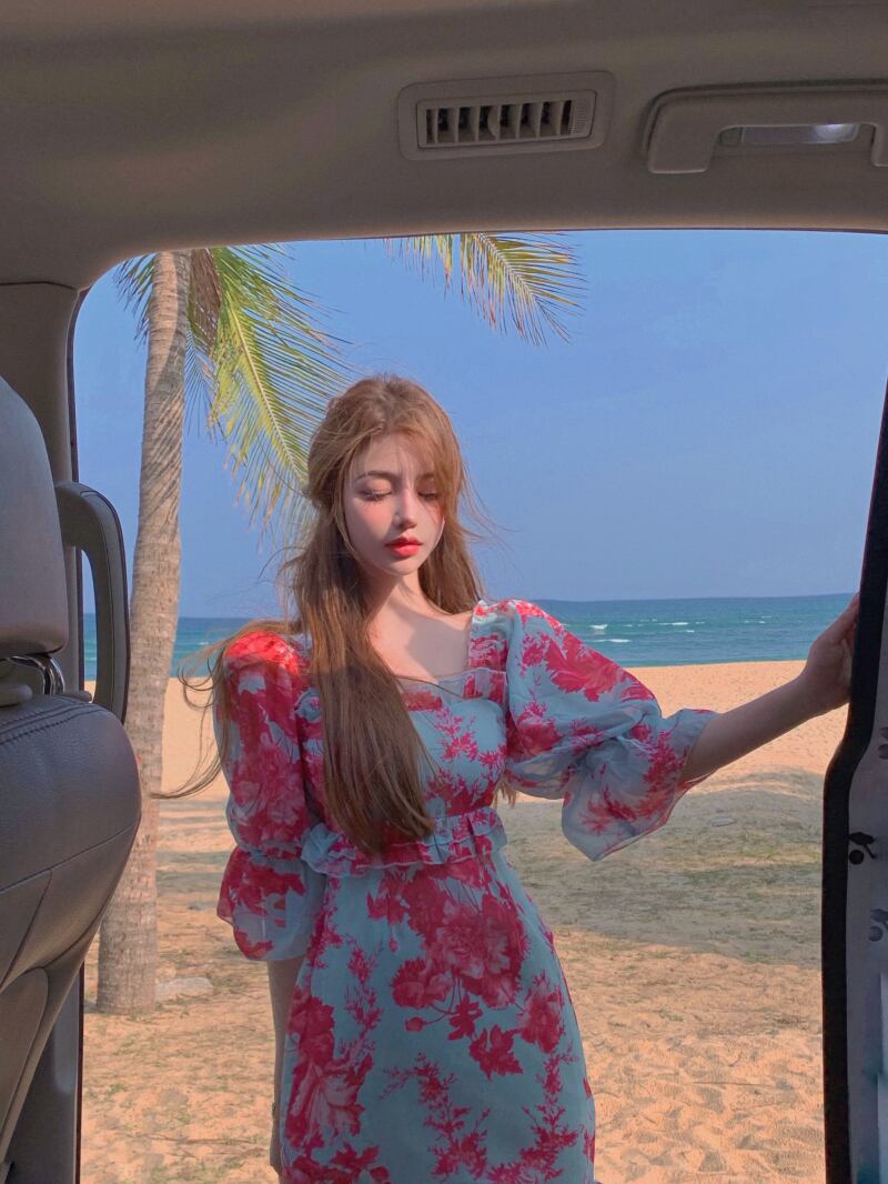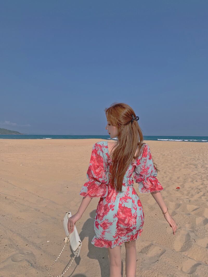 スリーブスカート サマーサイドカラーFlowerデザイン ドレス 夏物 フラワーデザイン スクウェア Xiaofeijia61080326290