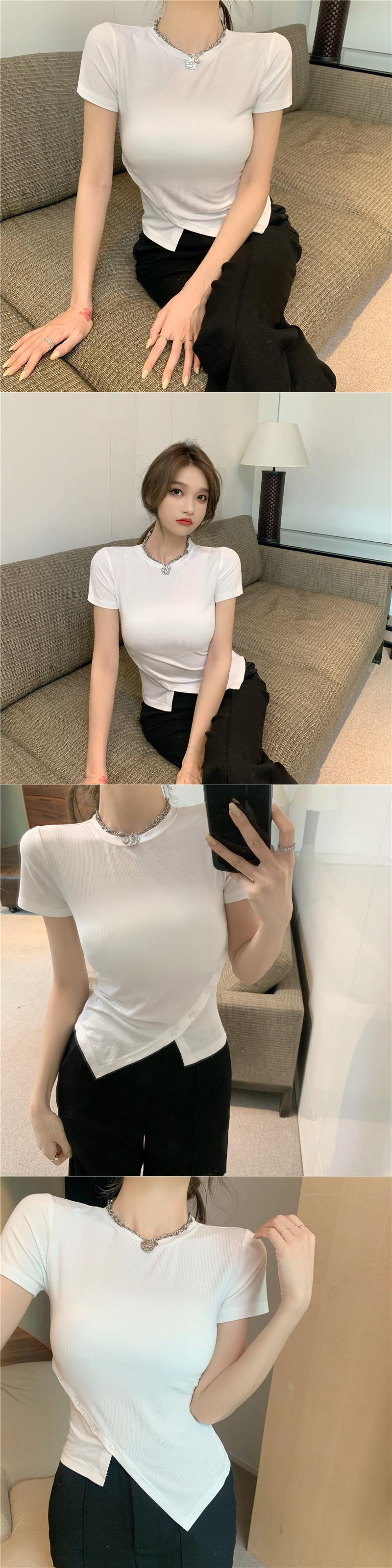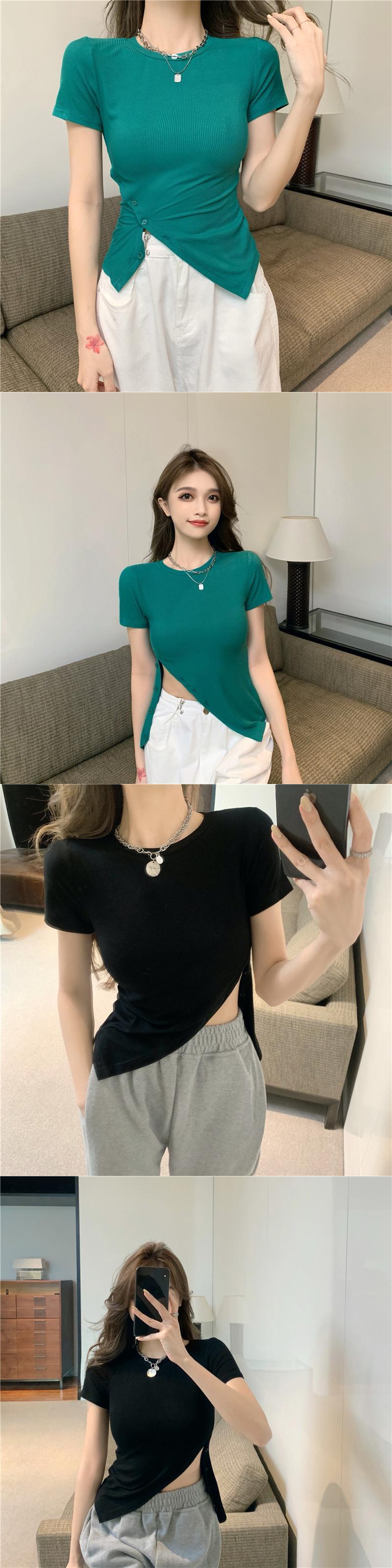 ショートTシャツ シャツ レディースサマースリムソリッド カラーバックルラウンドネックトップス 夏物 Oネック ソリッドカラー Xiaofeijia66524057834