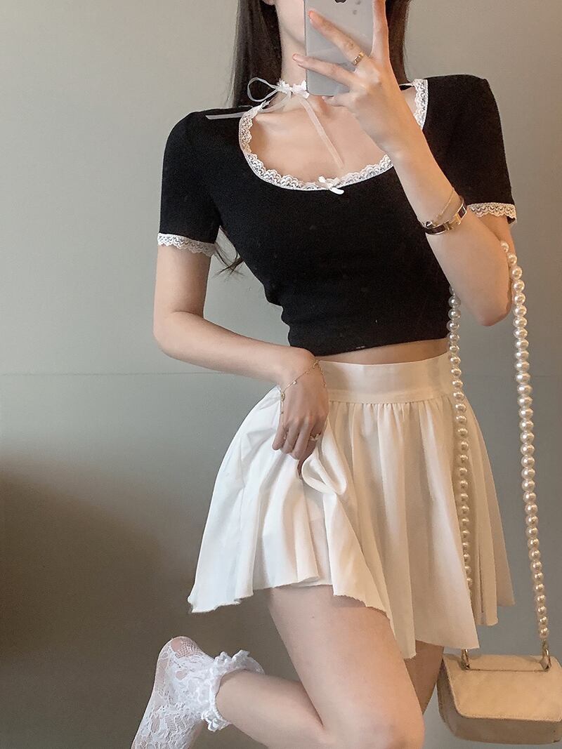 サマースタイルレースカラースリムシャツ ラウンドネックショートTシャツ 夏物 Oネック ピュア Xiaofeijia61469296338