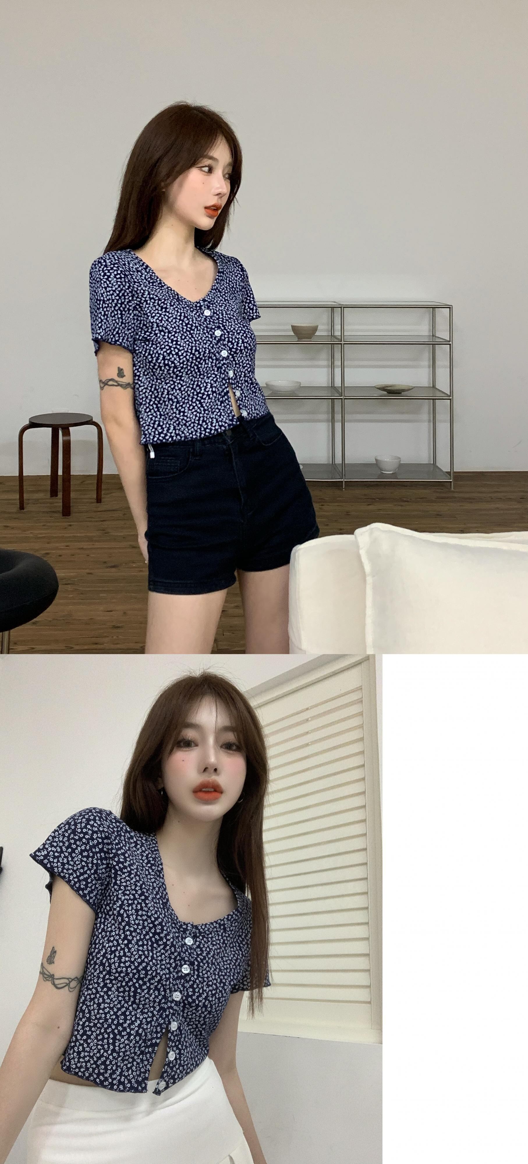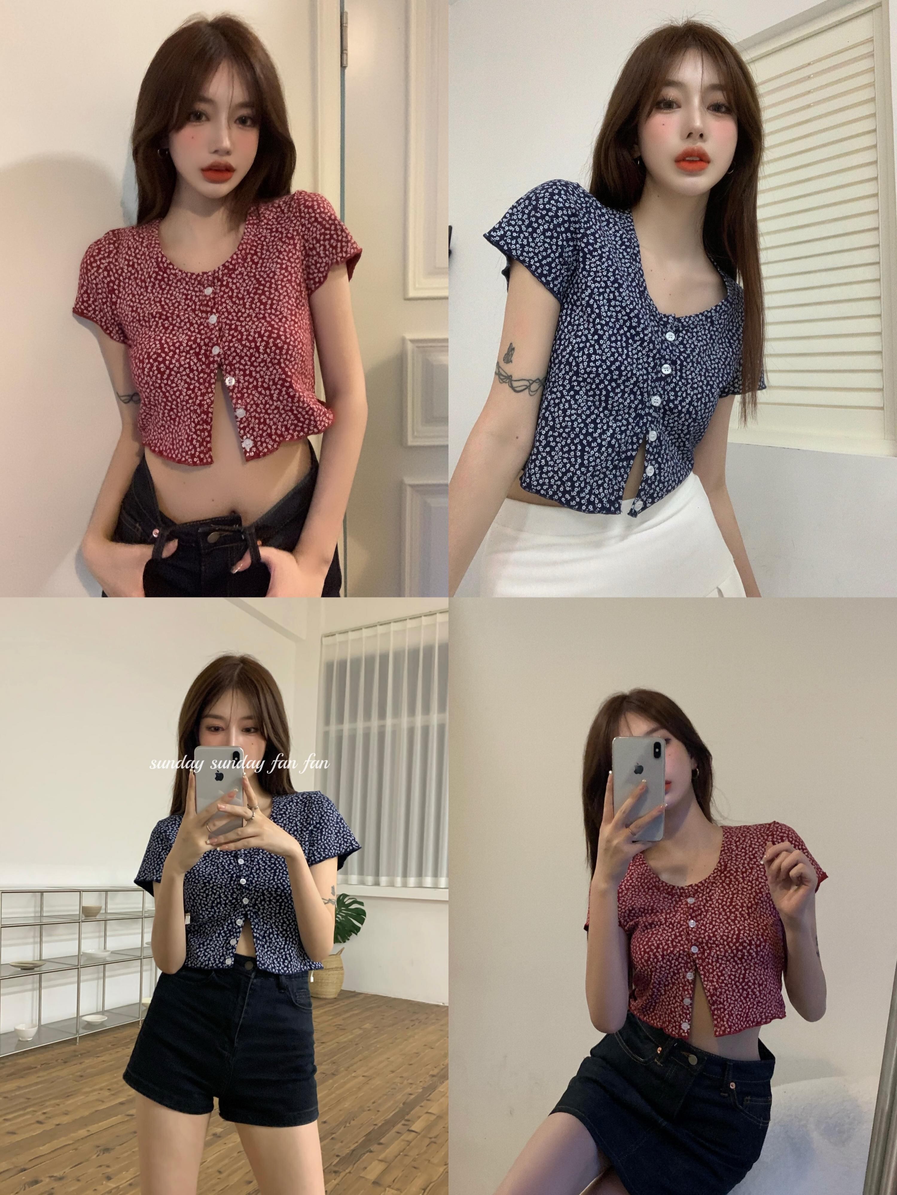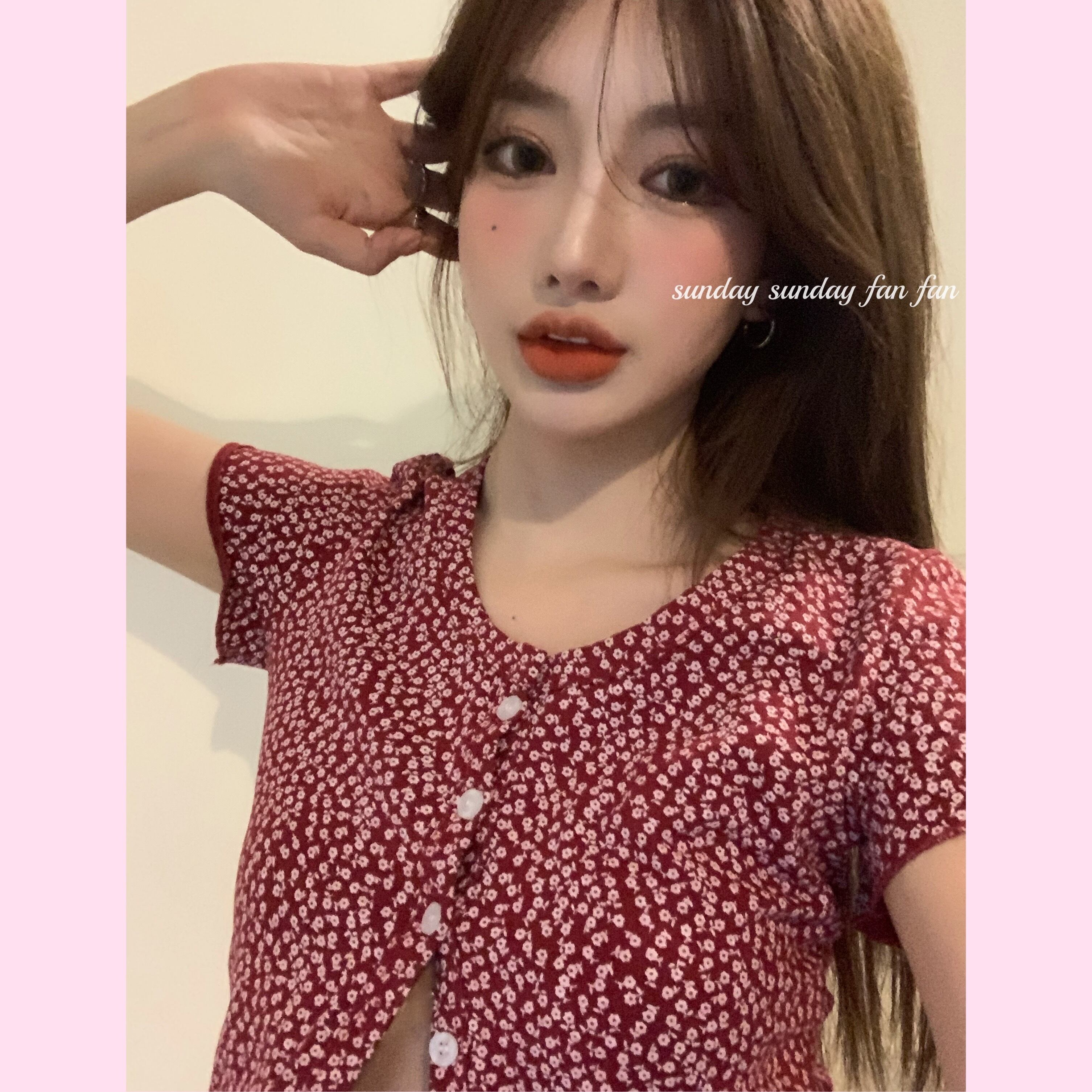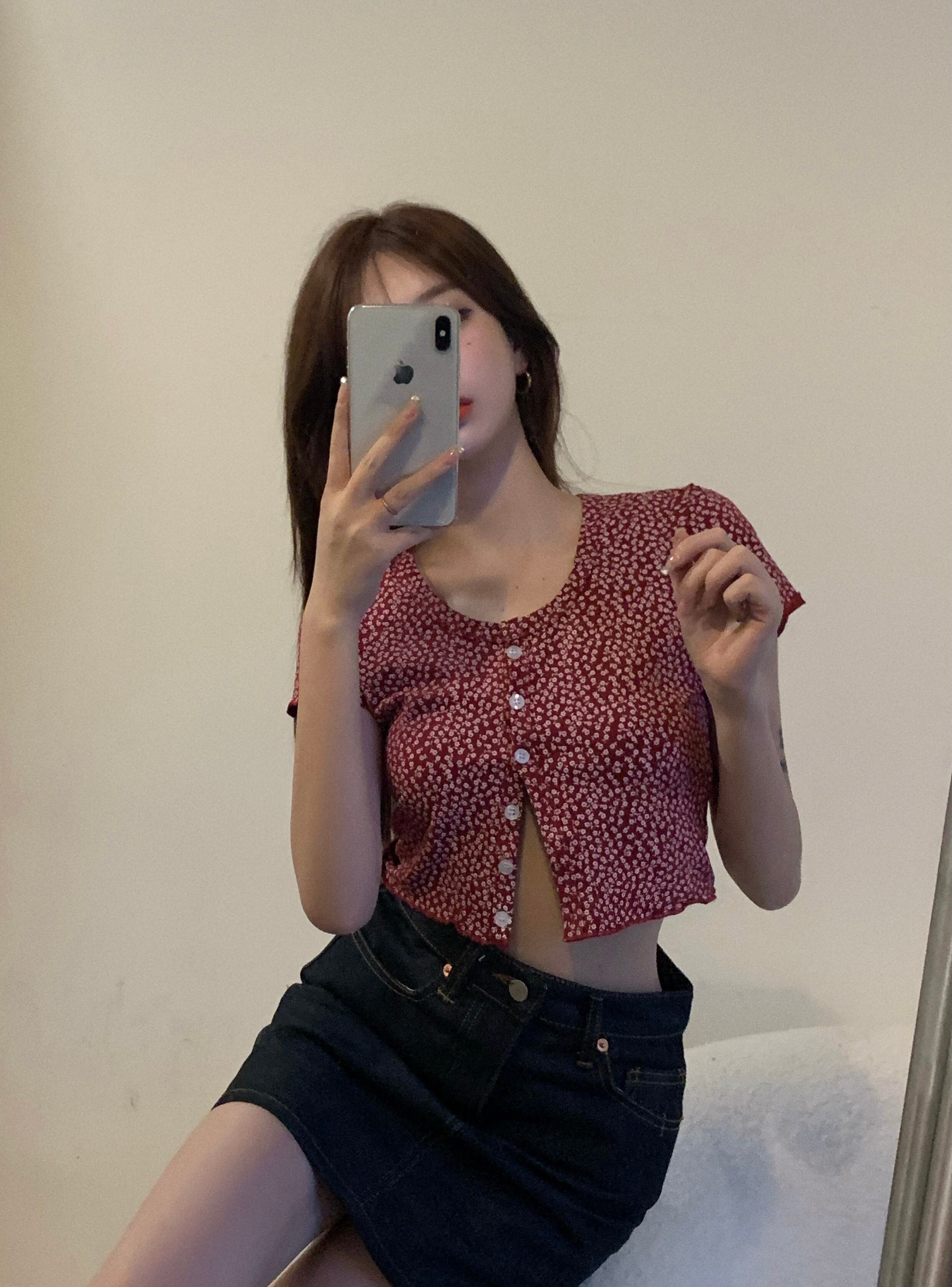スタンダードスタイルフローラルプリント柄ショートTシャツ トップス レトロ 花柄 Xiaofeijia47368804494