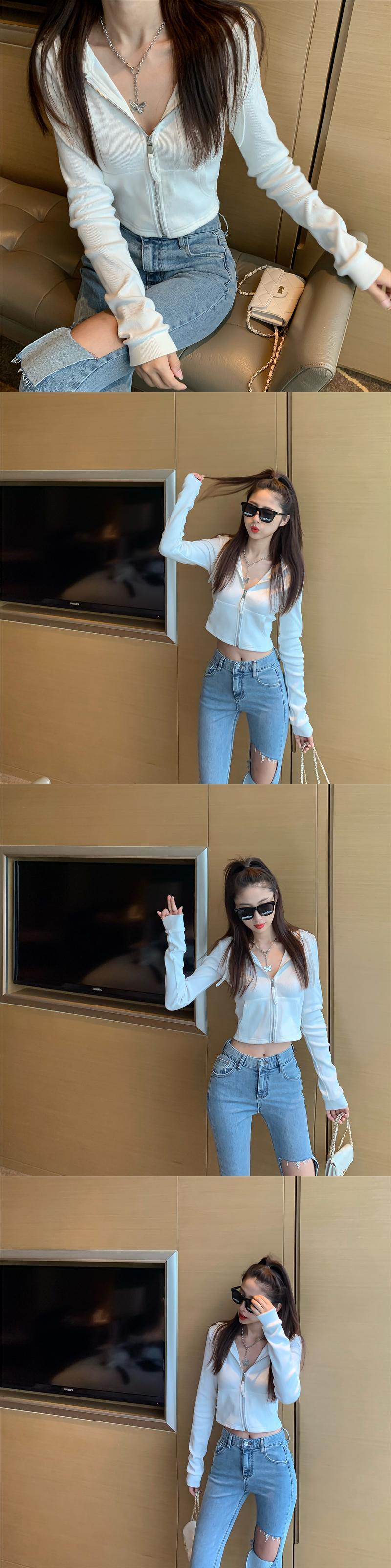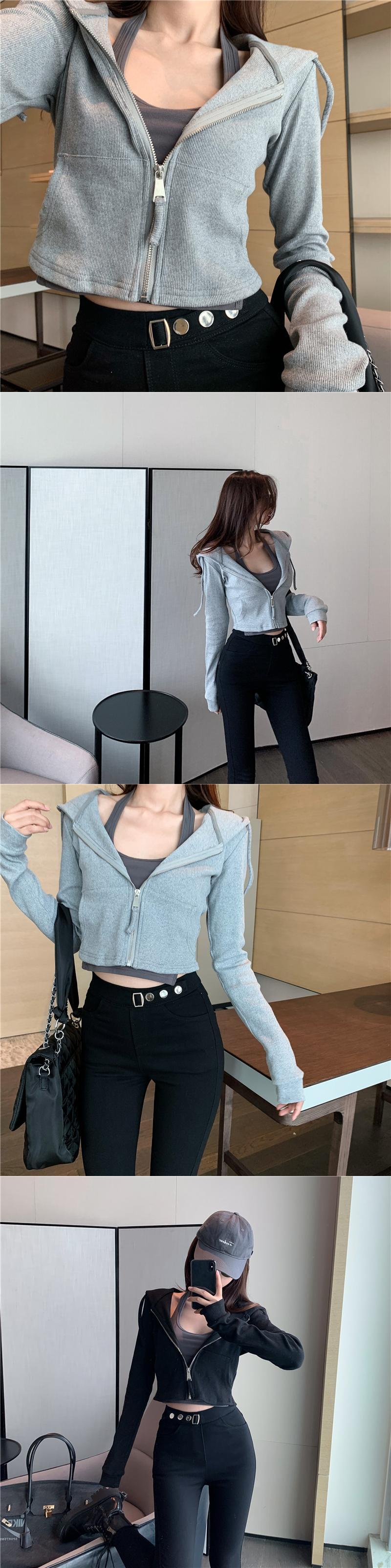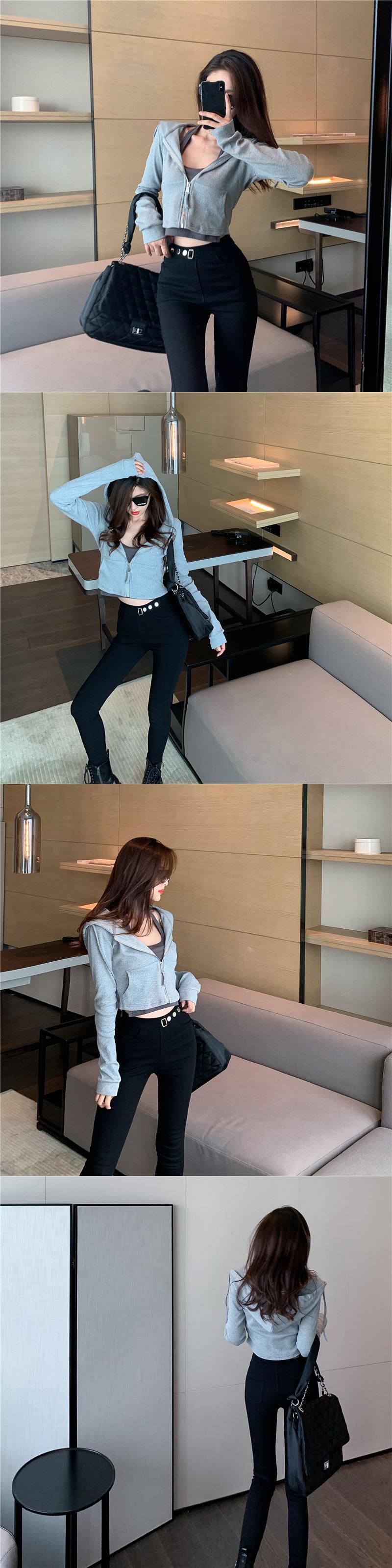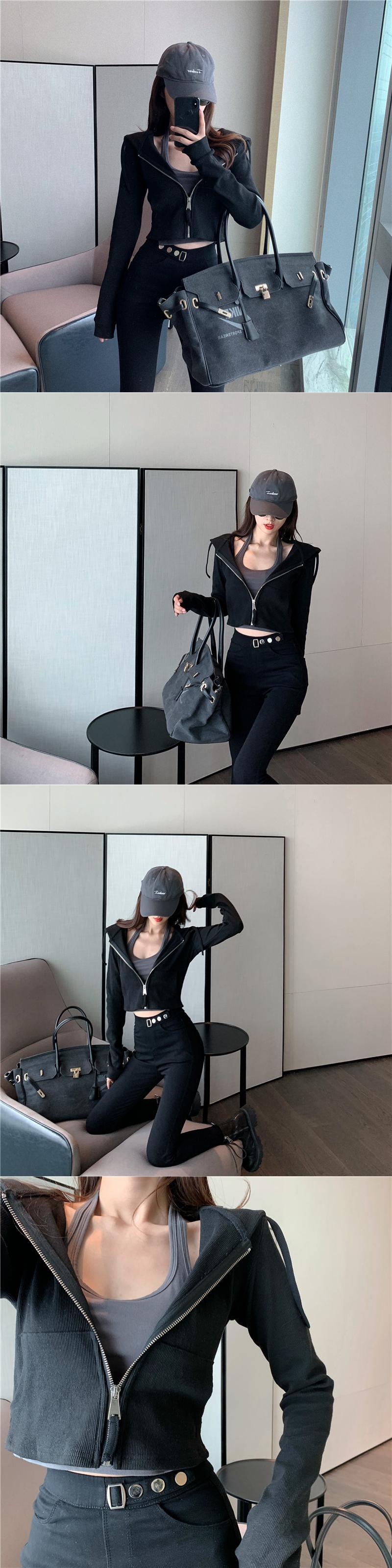 スプリングスリムショートフードニットカーディガンジャケット ウェストジッパートップス ロング 春物 Xiaofeijia6658861044