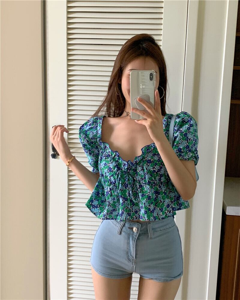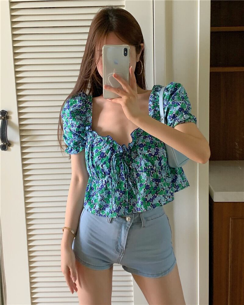 サマースリーブハイウェストウェストカラープリントショートシャツ ブラウス フローラル 夏物 花柄 スクウェア Xiaofeijia74089199872