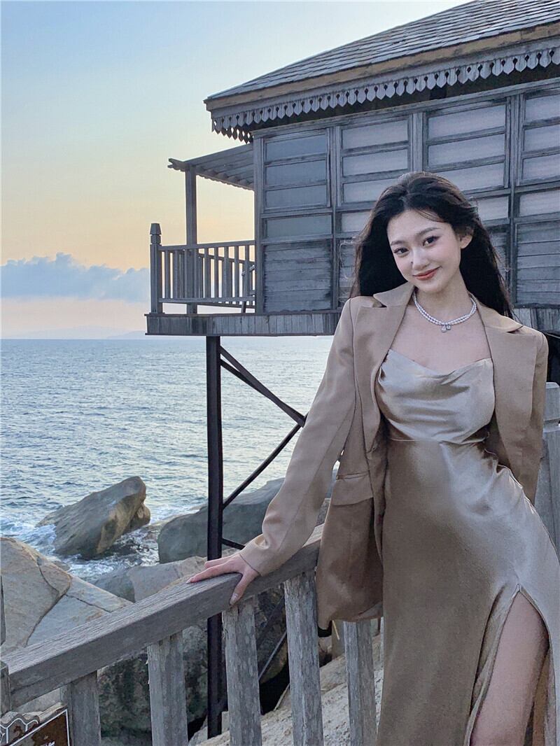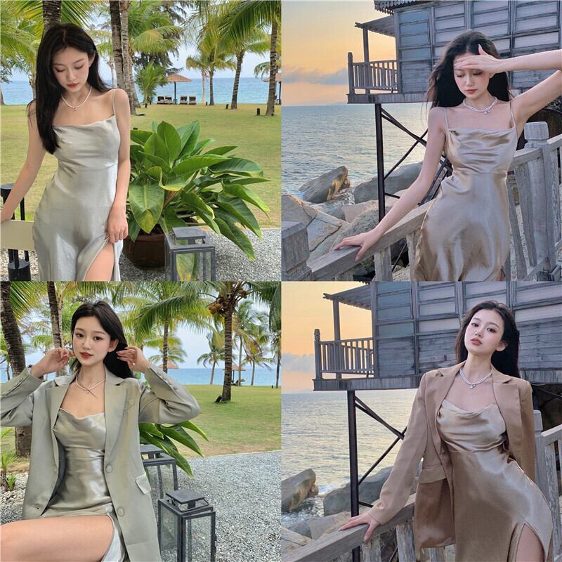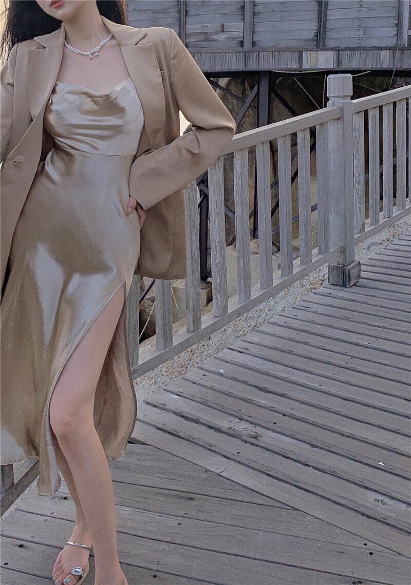 スタイルサマー薄手サテンスリットドレス 夏物 Xiaofeijia1616182786