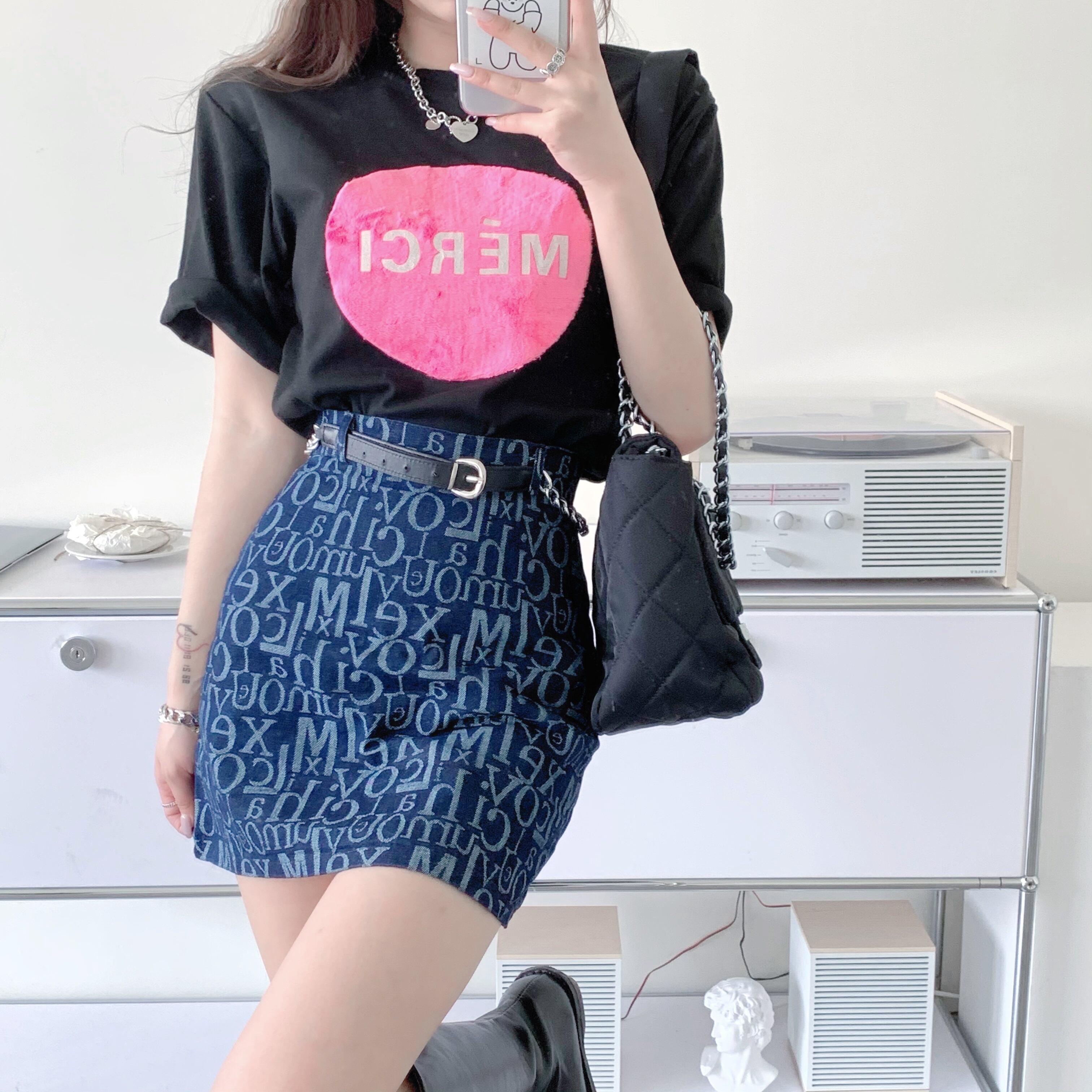 色:黒いTシャツ,白いTシャツ,ダークブルーのスカート,ライトブルーのスカート