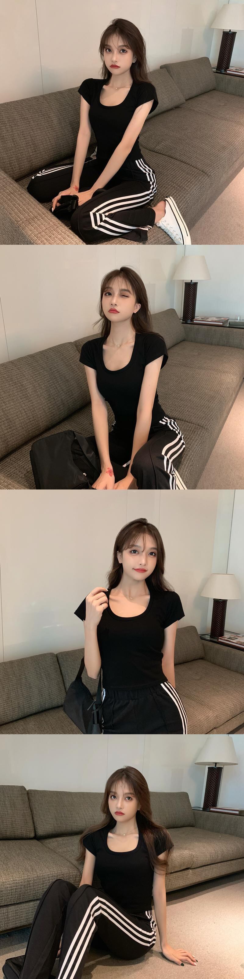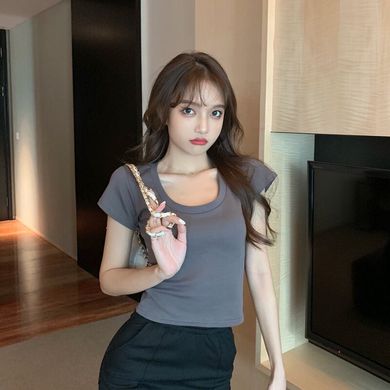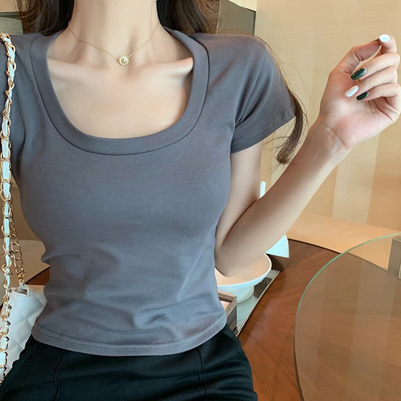 サマースリムショートTシャツ 薄手ソリッド カラートップス 夏物 ソリッドカラー Xiaofeijia74246220842
