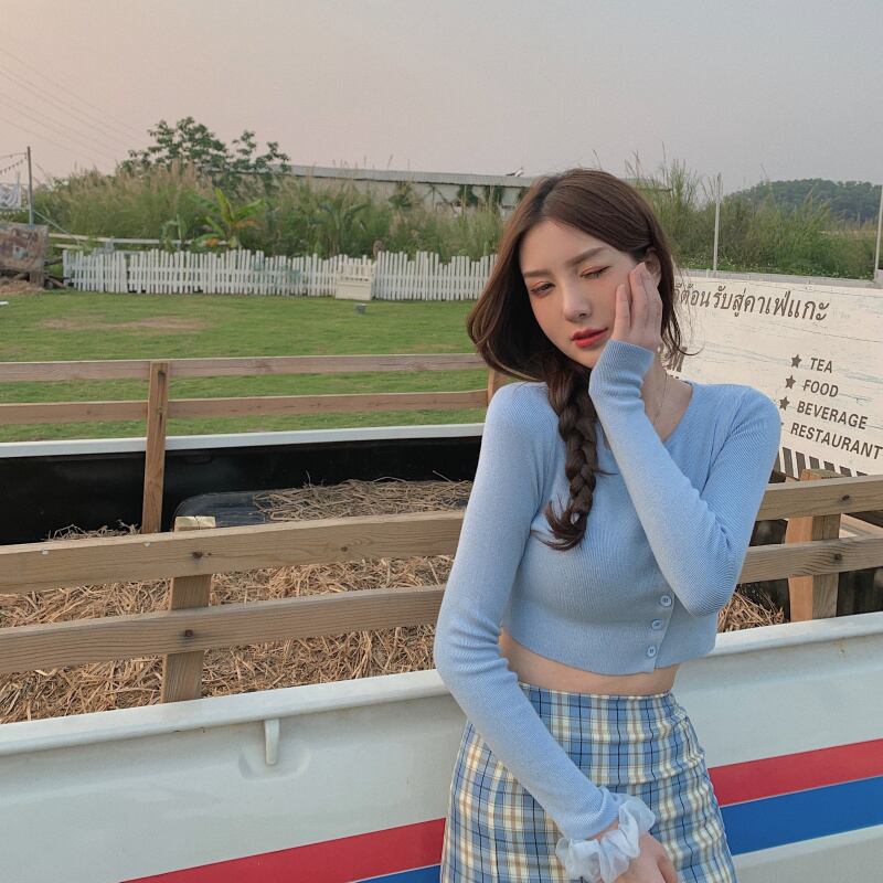 薄手スプリングショートニットカーディガン格子柄スカート レディース ロング 春物 Xiaofeijia44019528180