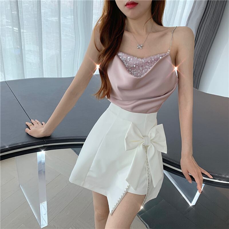 レッドサマーサテンラインストーンリボンスカート レディース ストリート 夏物 ステッチ Xiaofeijia82982732939