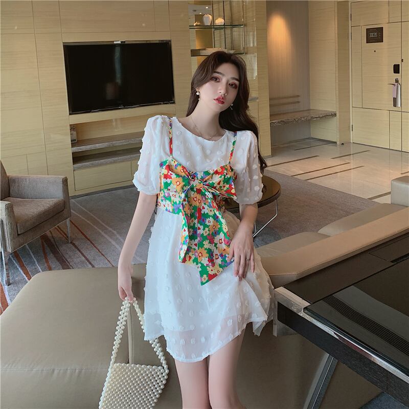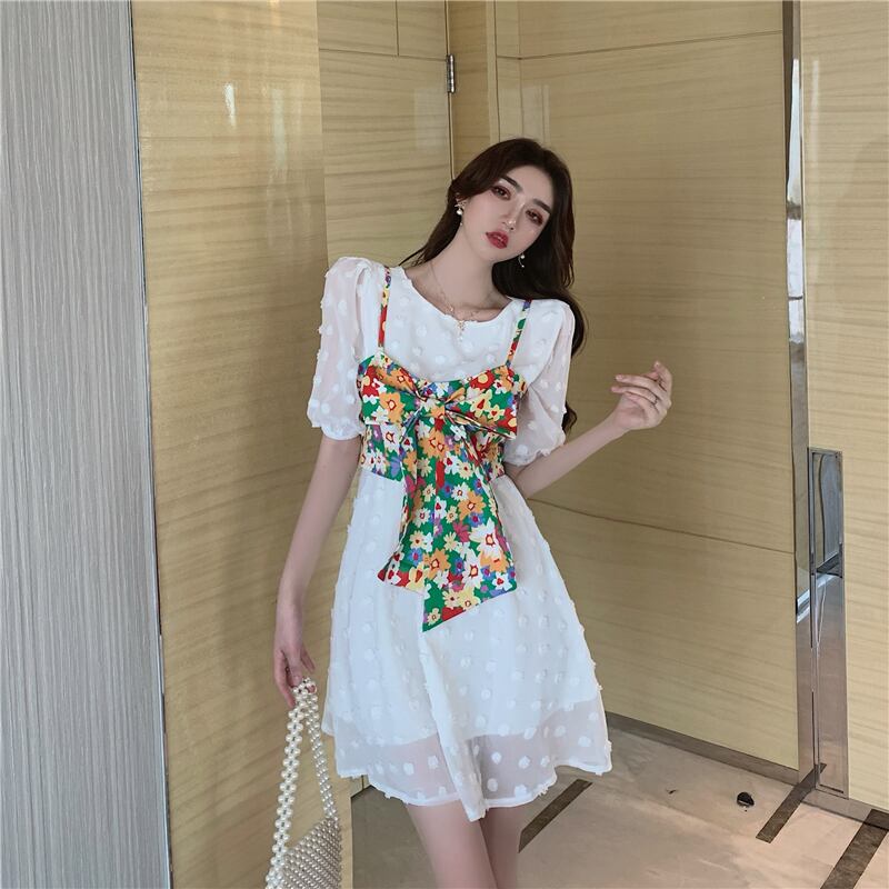 レッドスタンダードカラーリボンショートスリーブウェストドレス レトロ Xiaofeijia207165601