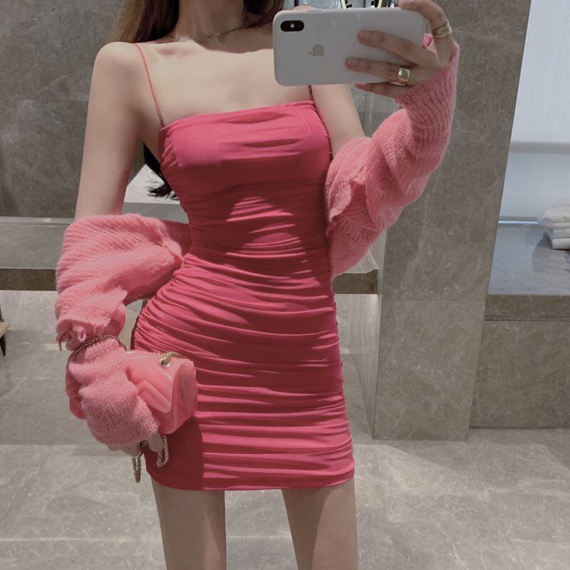 色:フクシアニットカーディガン,ホワイトニットカーディガン,ピンクのスカート,黒スカート