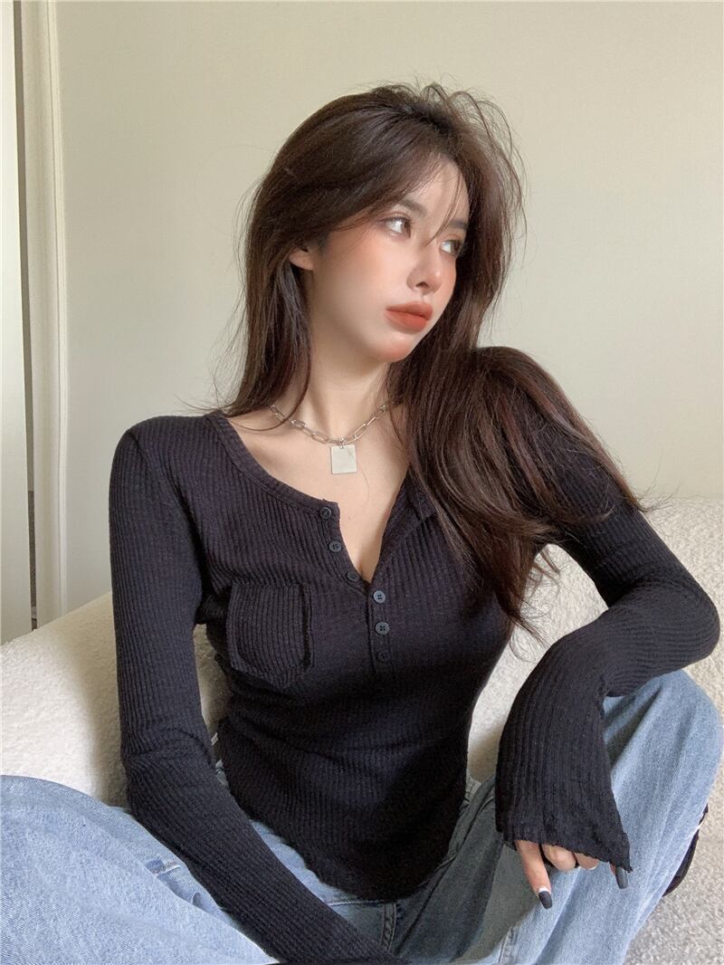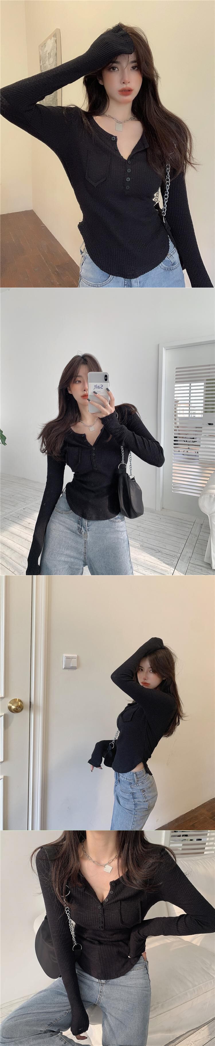 スリムボタンVネックショートTシャツ シャツ トップス スプリング ロング 春物 Xiaofeijia31344182828