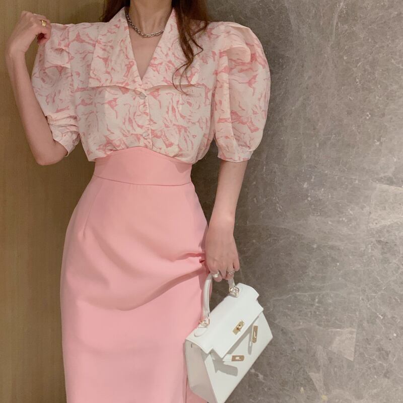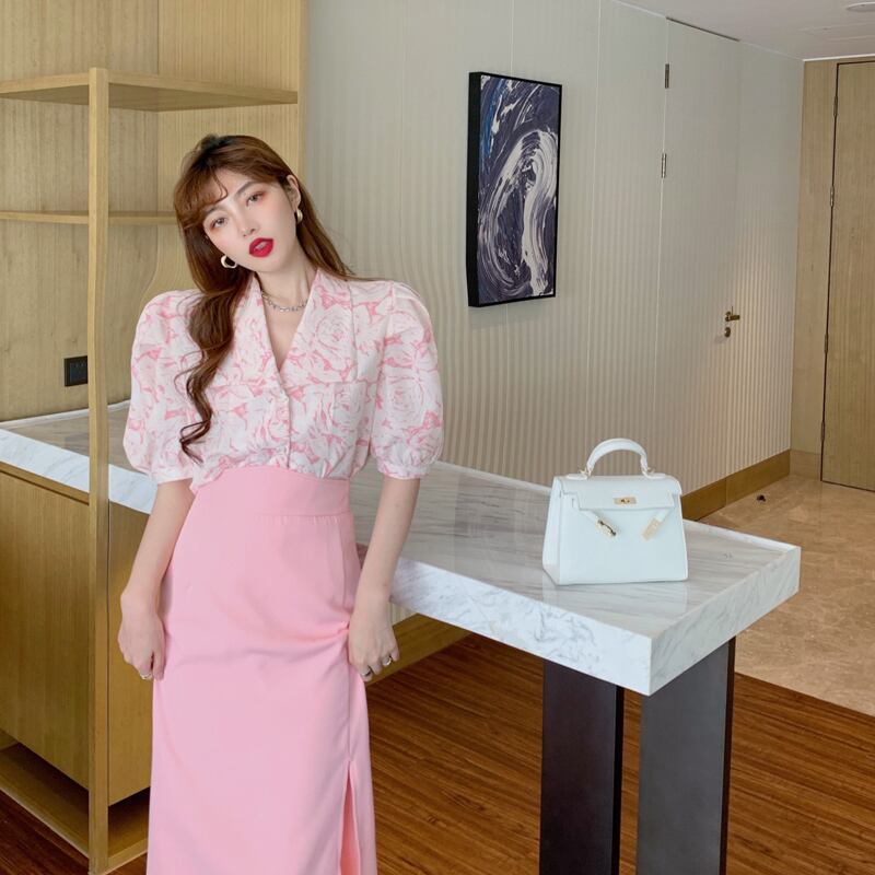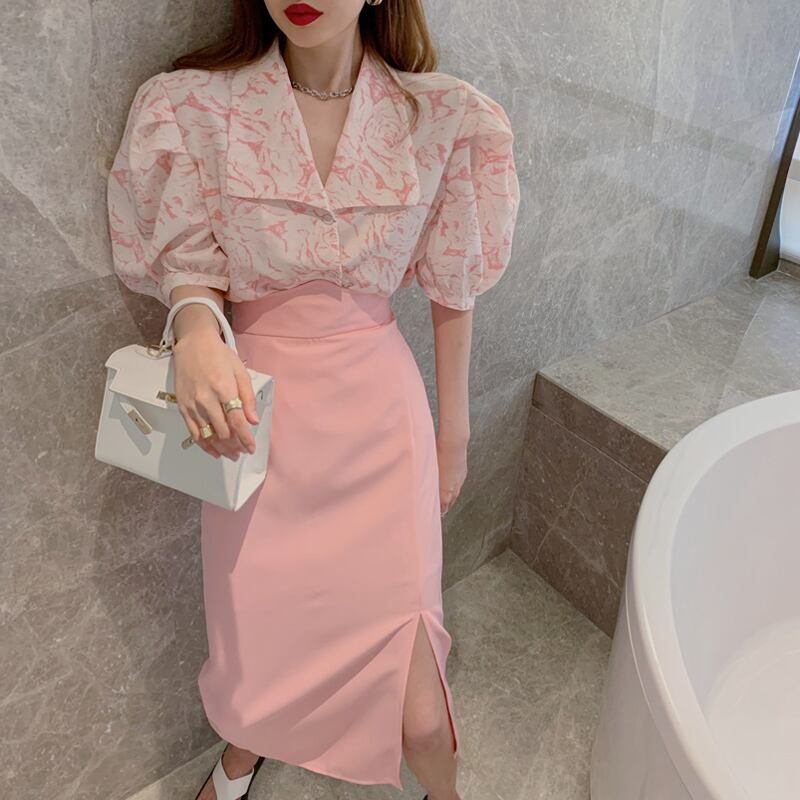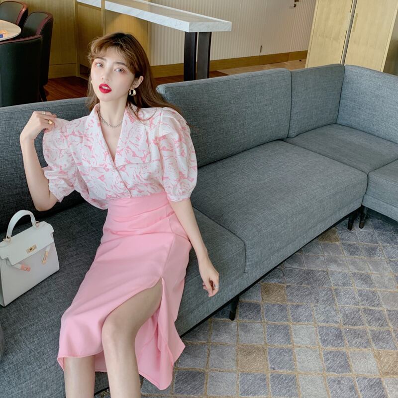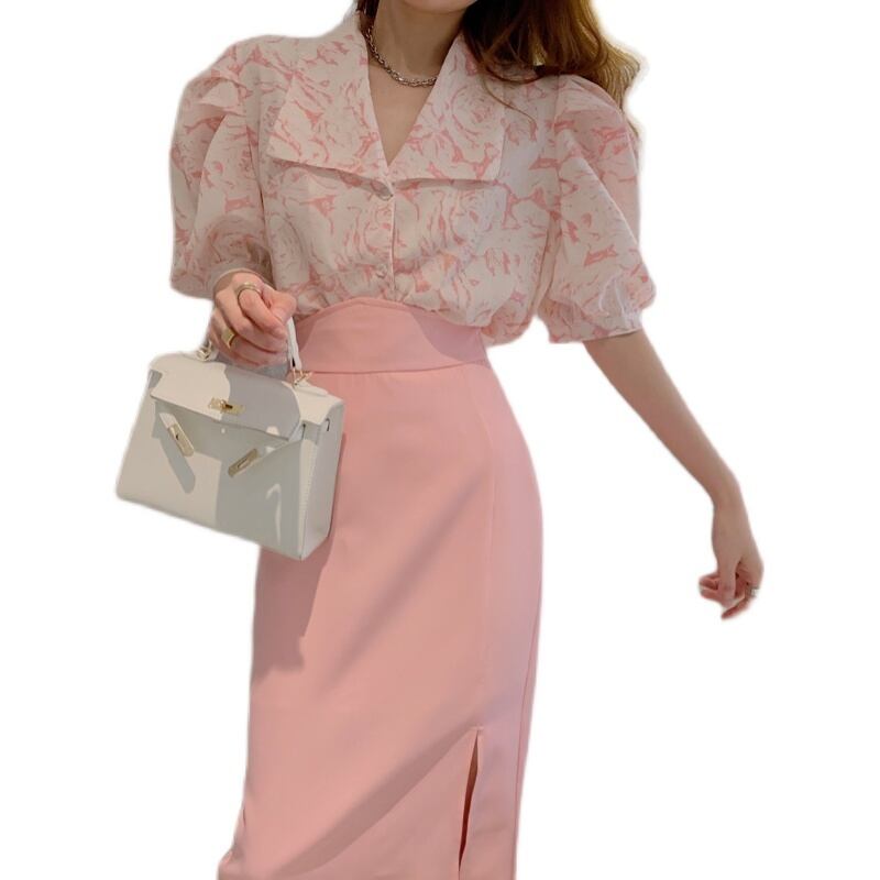 サマースタイルプリントスリーブシフォンシャツ サイドスリットハイウェストウェストスカート 夏物 Xiaofeijia69186187757