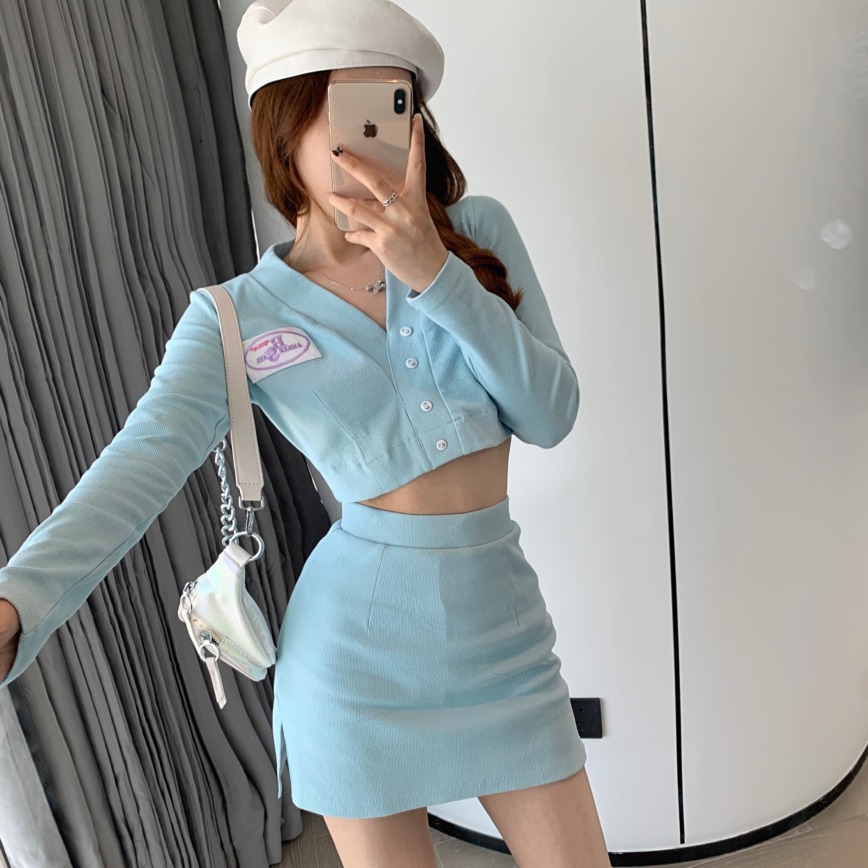 レディーススプリングVネックショートカーディガンハイウェストウェストスカート 春物 Xiaofeijia79543218649