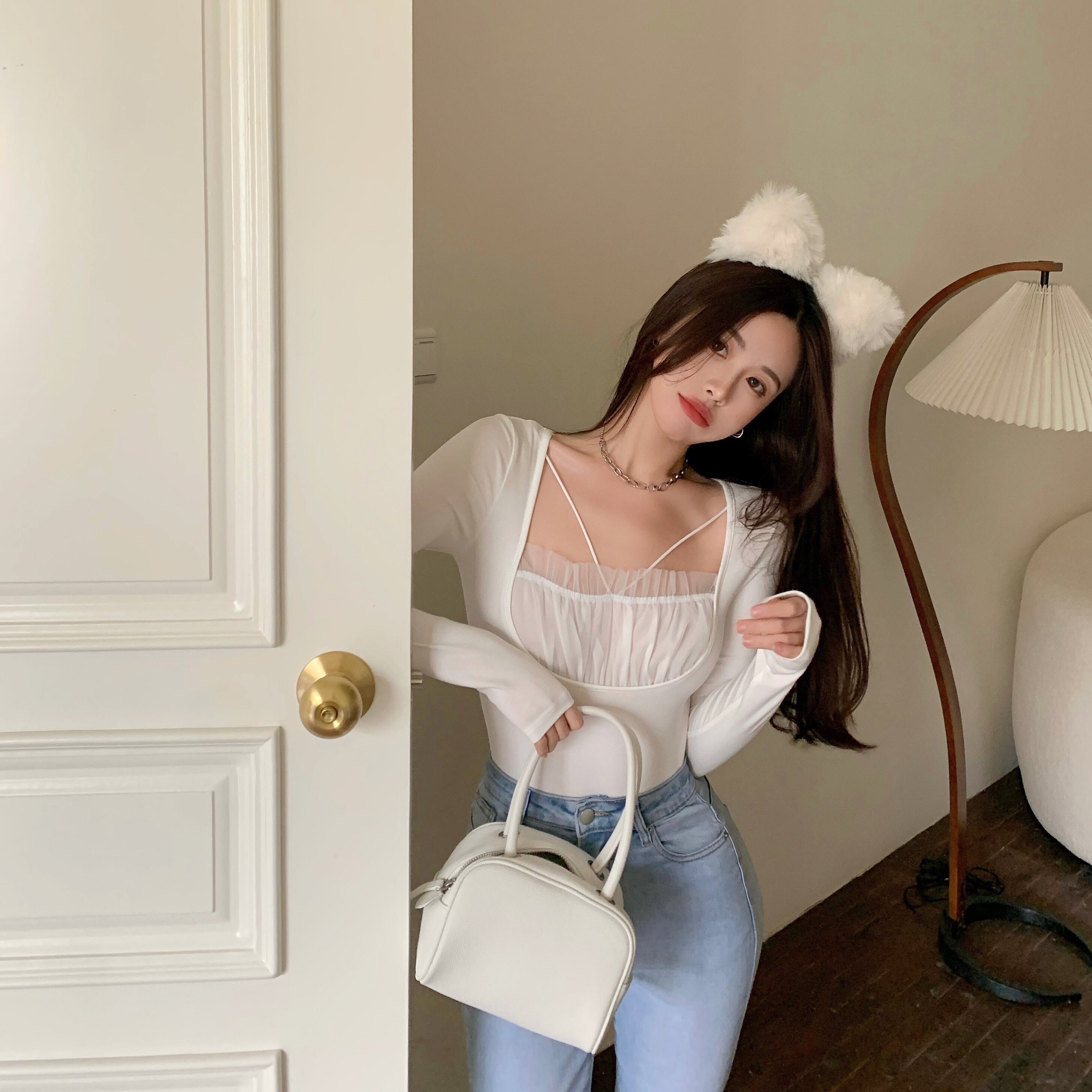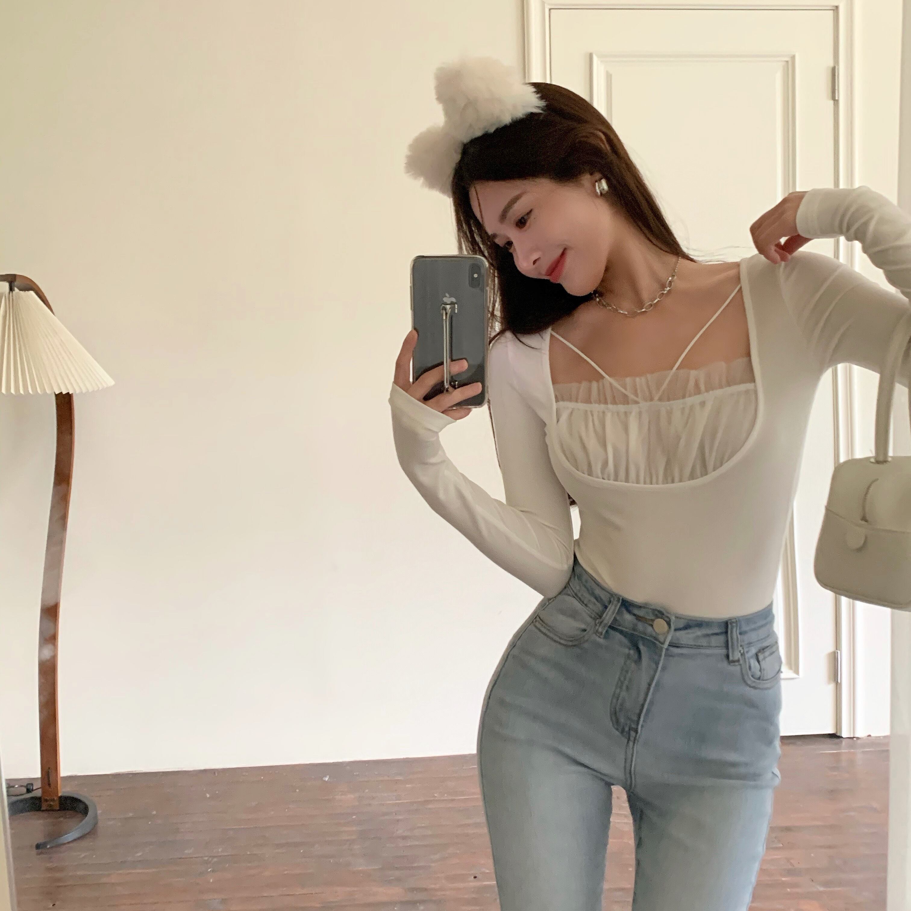 Tシャツ シャツ スプリングメッシュスリムショートトップス ロング 春物 ステッチ Xiaofeijia56527169550