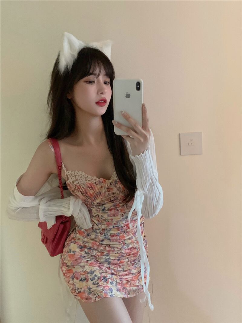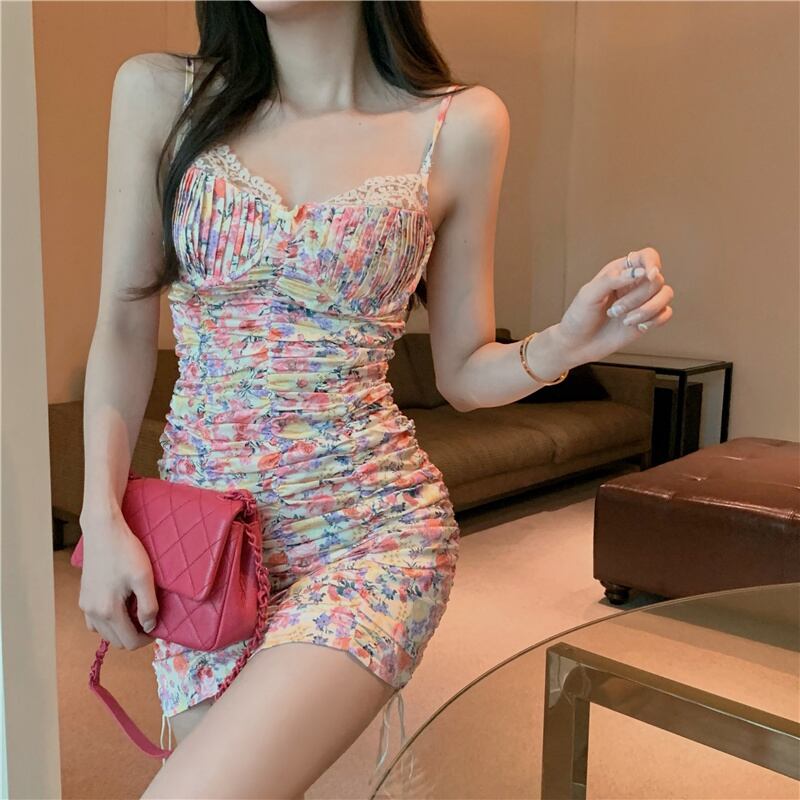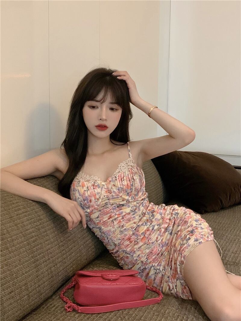 ヴィンテージフローラルレースプリーツスリムドレス 花柄 ビンテージ Xiaofeijia31822061457