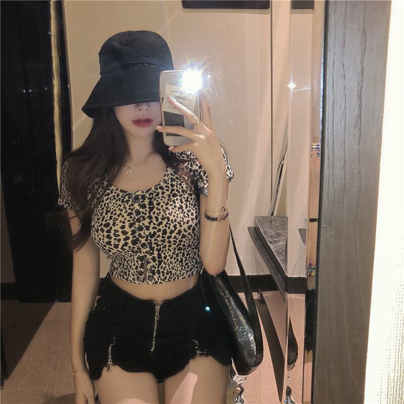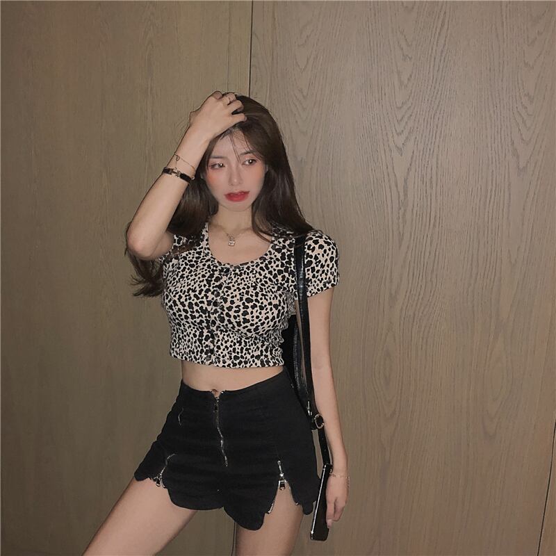 Tシャツ シャツ サマースリムラウンドネックレオパードプリント柄ショートカーディガントップス 夏物 Oネック Xiaofeijia56429815171