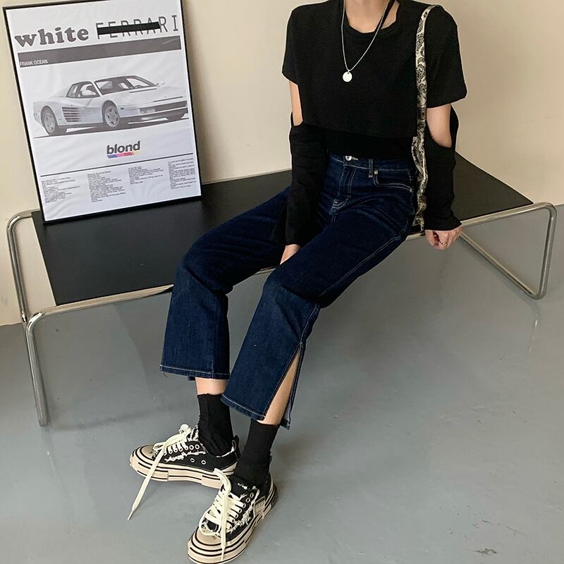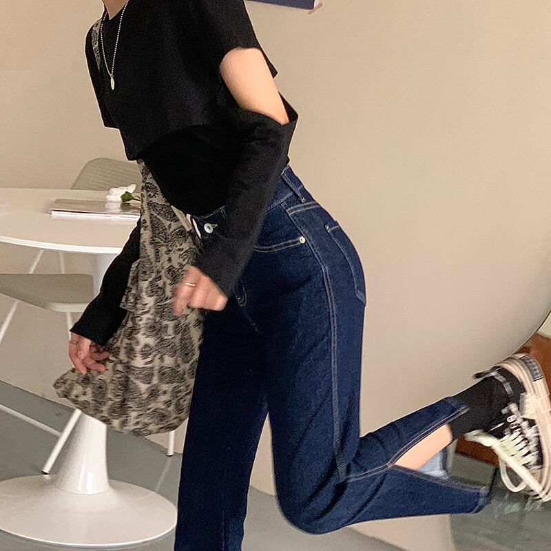 ダークブルージーンズ レディーススプリングパンツ 薄手サイドスリットルーズハイウェストウェストクロップド 春物 Xiaofeijia35147395910