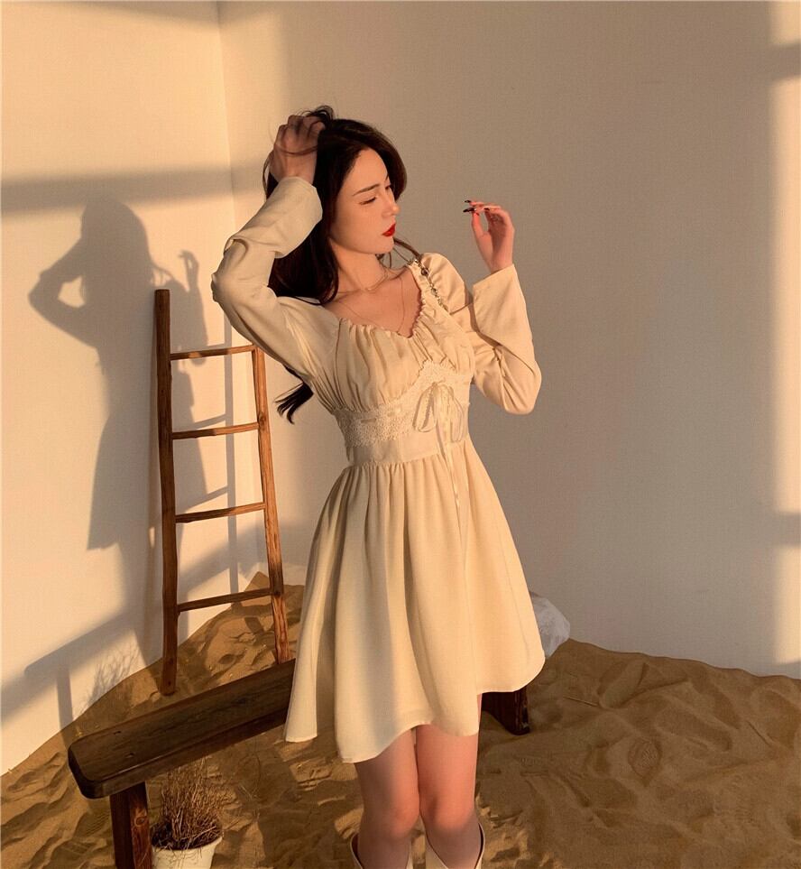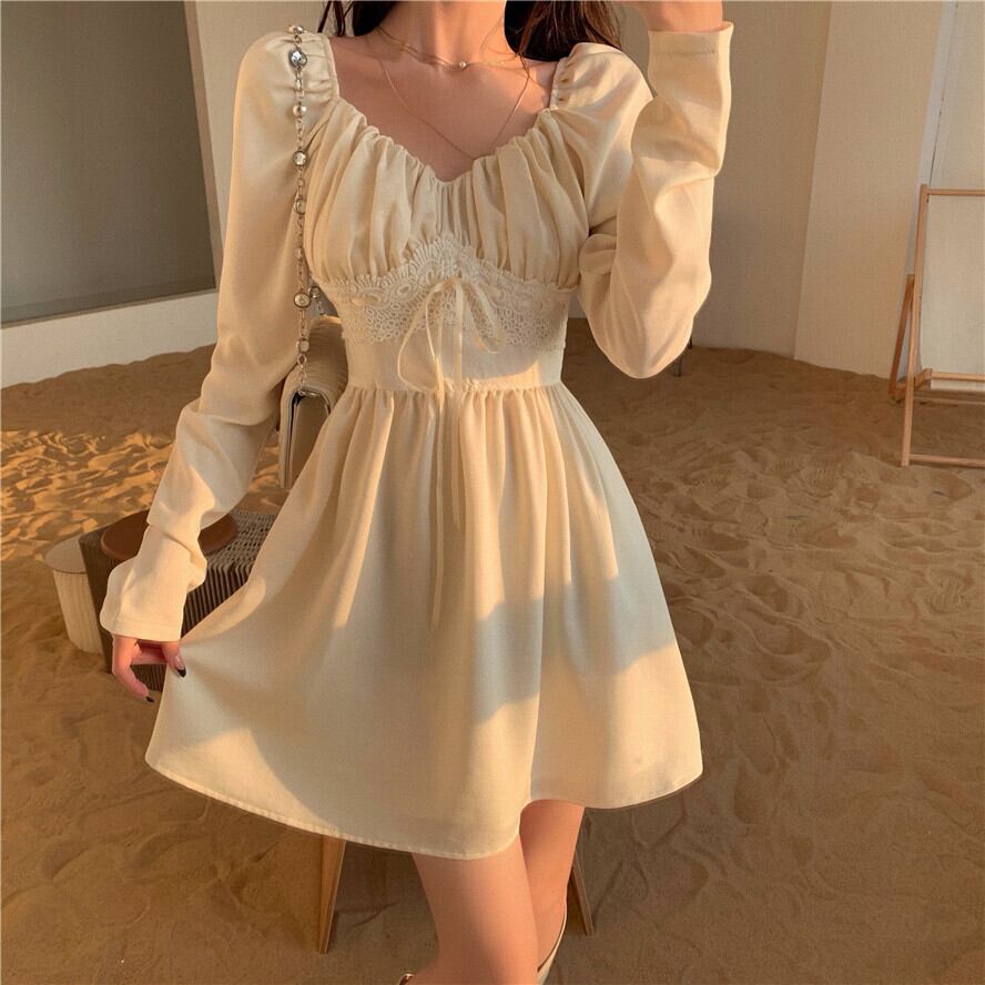 スタンダードVネックドレス スプリングスタイルウェストスカート ギャザー ロング レトロ 春物 Xiaofeijia27830279111