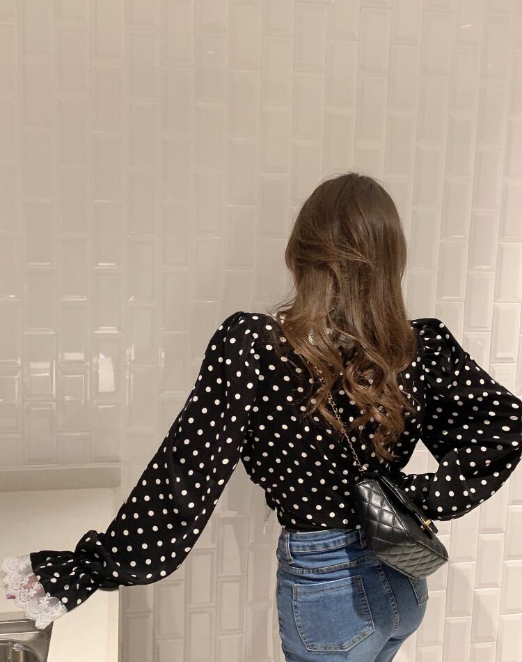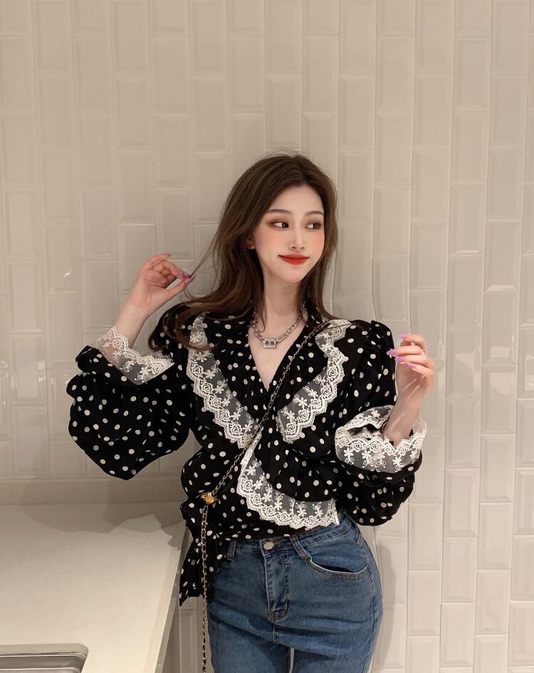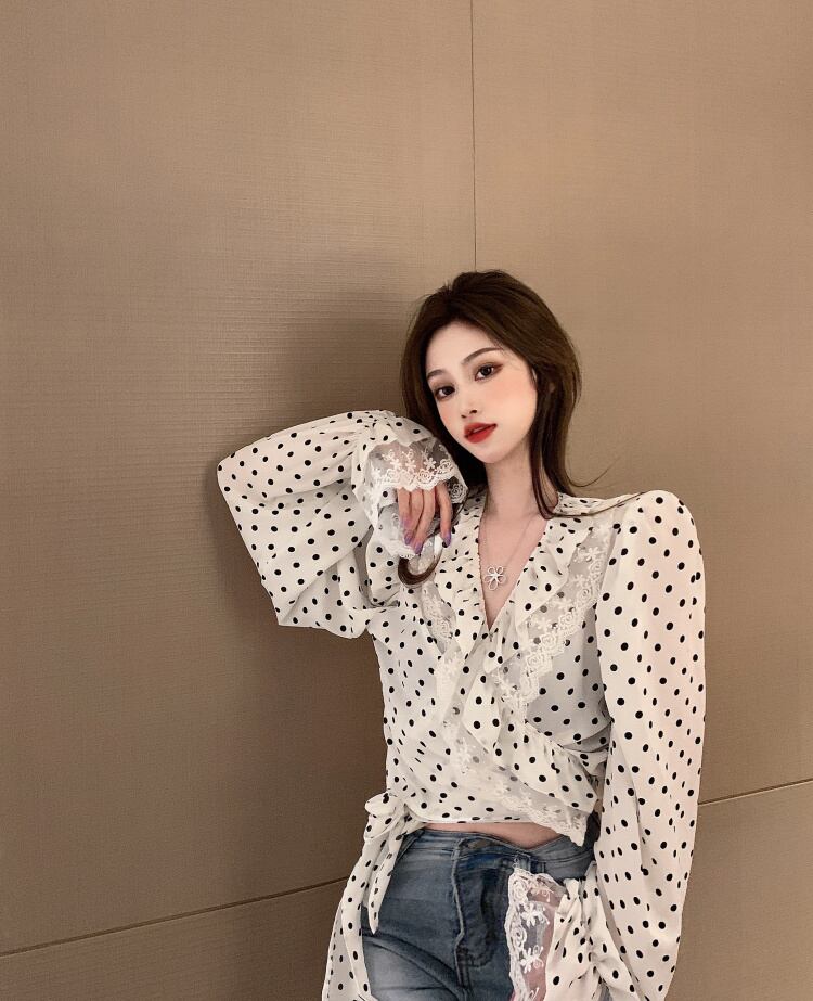 スプリングVネックシフォンシャツ プリーツレーストップス ロング 春物 ステッチ Xiaofeijia17605559874