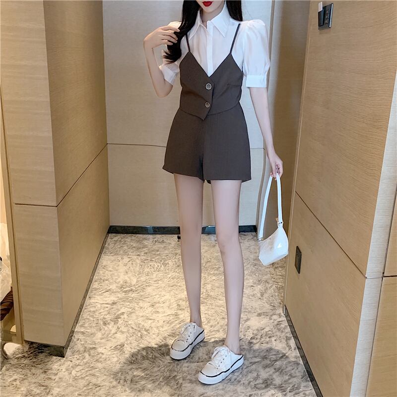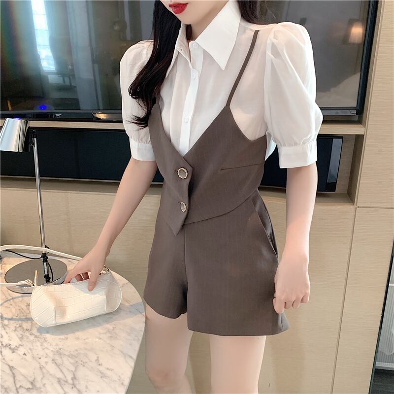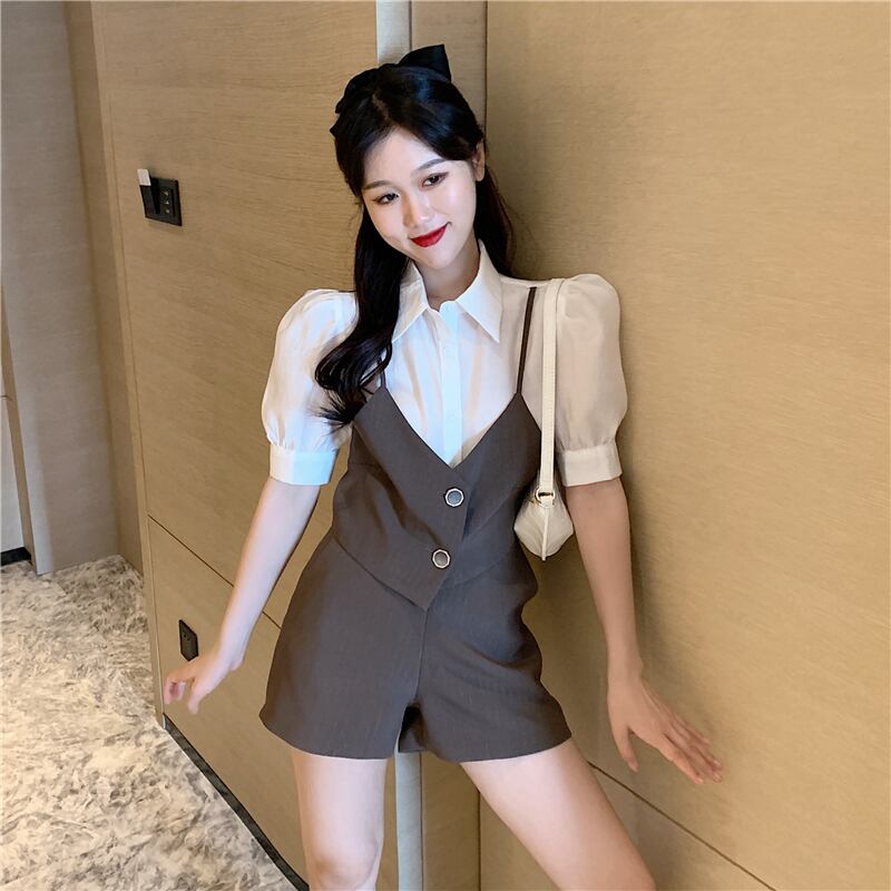 サマーレディースカラーシャツ ツーピース トップス ウェストワイドレッグパンツ ショーツ 夏物 ブルマー ワイドパンツ Xiaofeijia99212319782