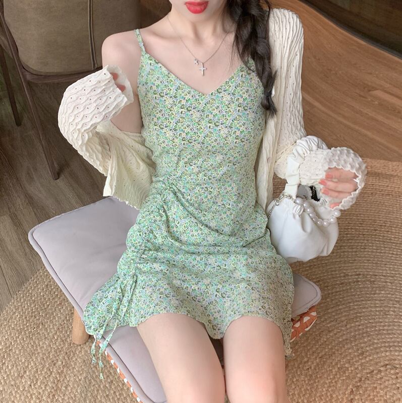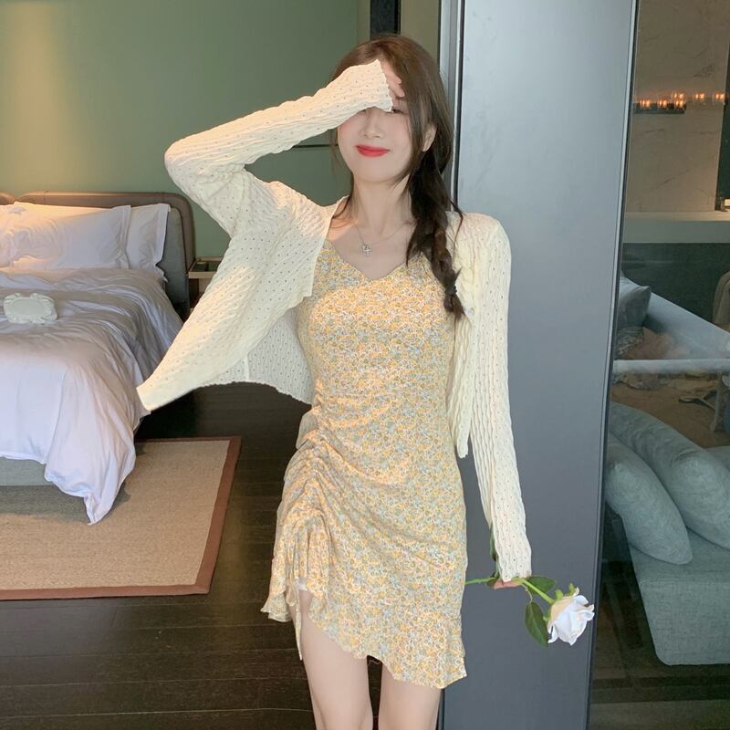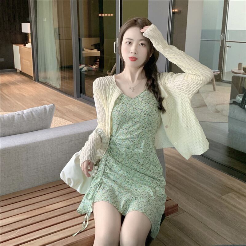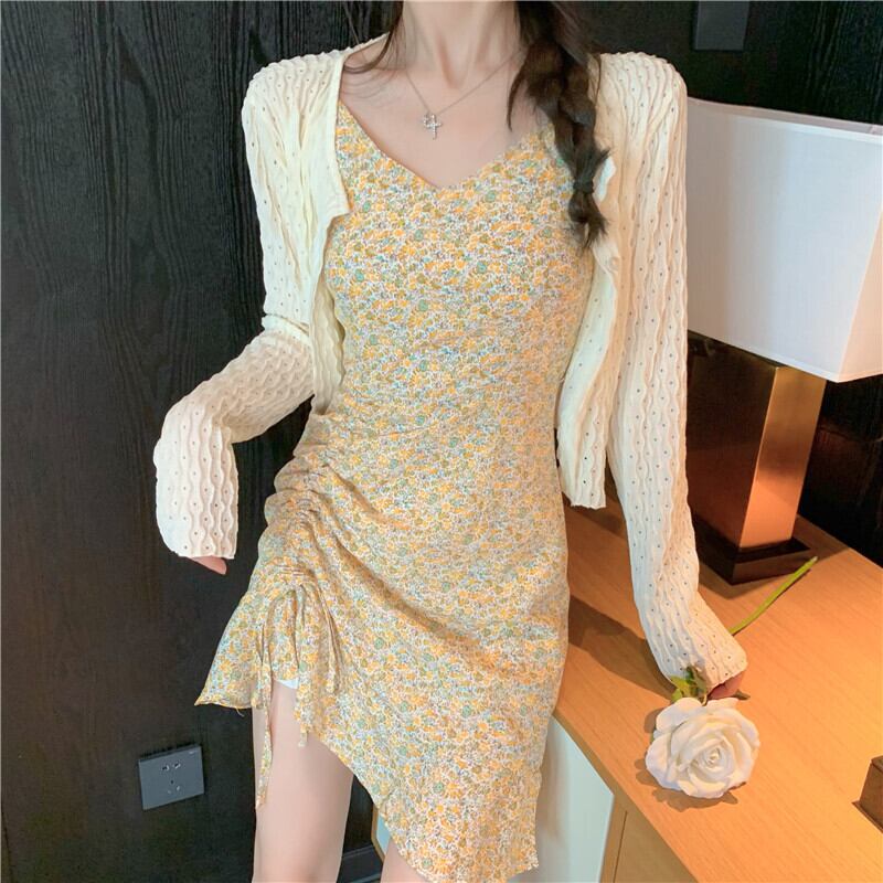 スプリングスカート セット レディースフローラルギャザードレス 薄手ニットカーディガンツーピース 春物 花柄 Xiaofeijia72747950