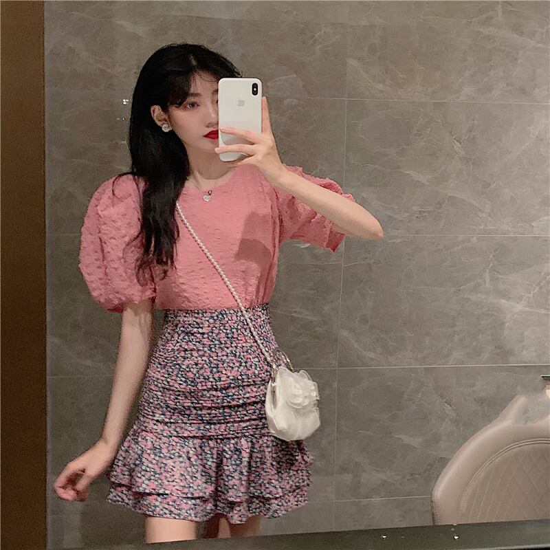 プリーツスリーブトップス スタンダードフローラルスカート レトロ 花柄 Xiaofeijia61204212303