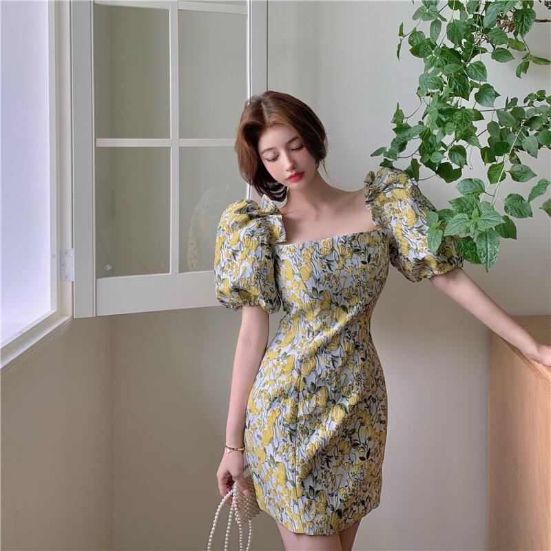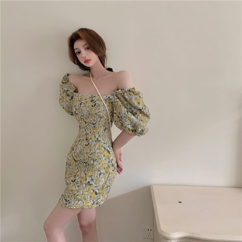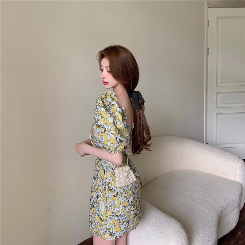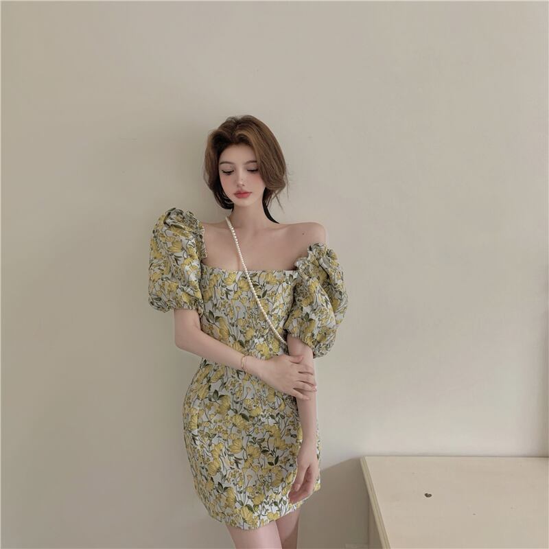 スタンダードスリーブフローラルドレス ワンショルダー レトロ 花柄 Xiaofeijia65282933872