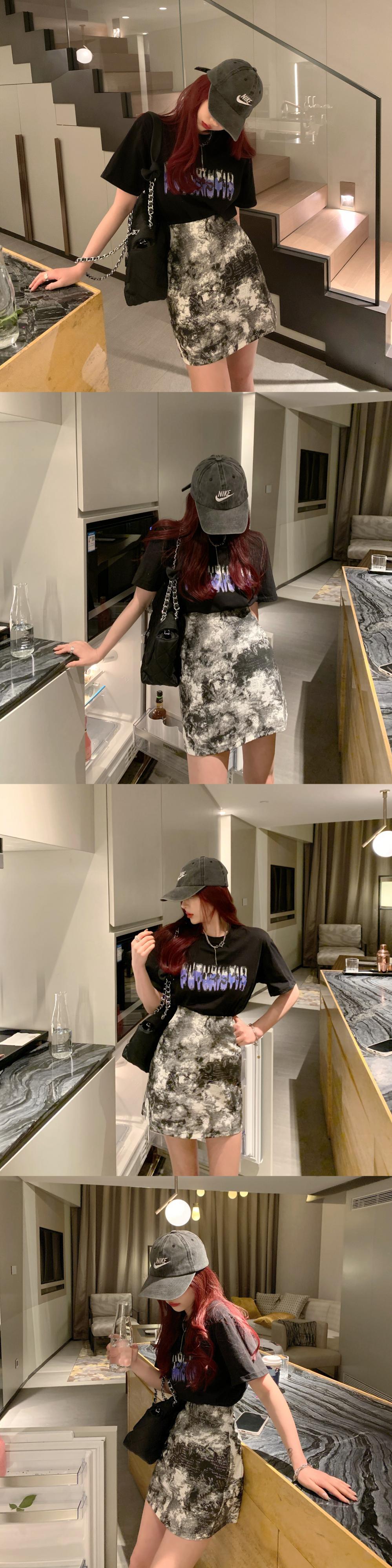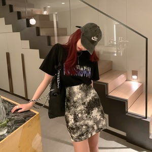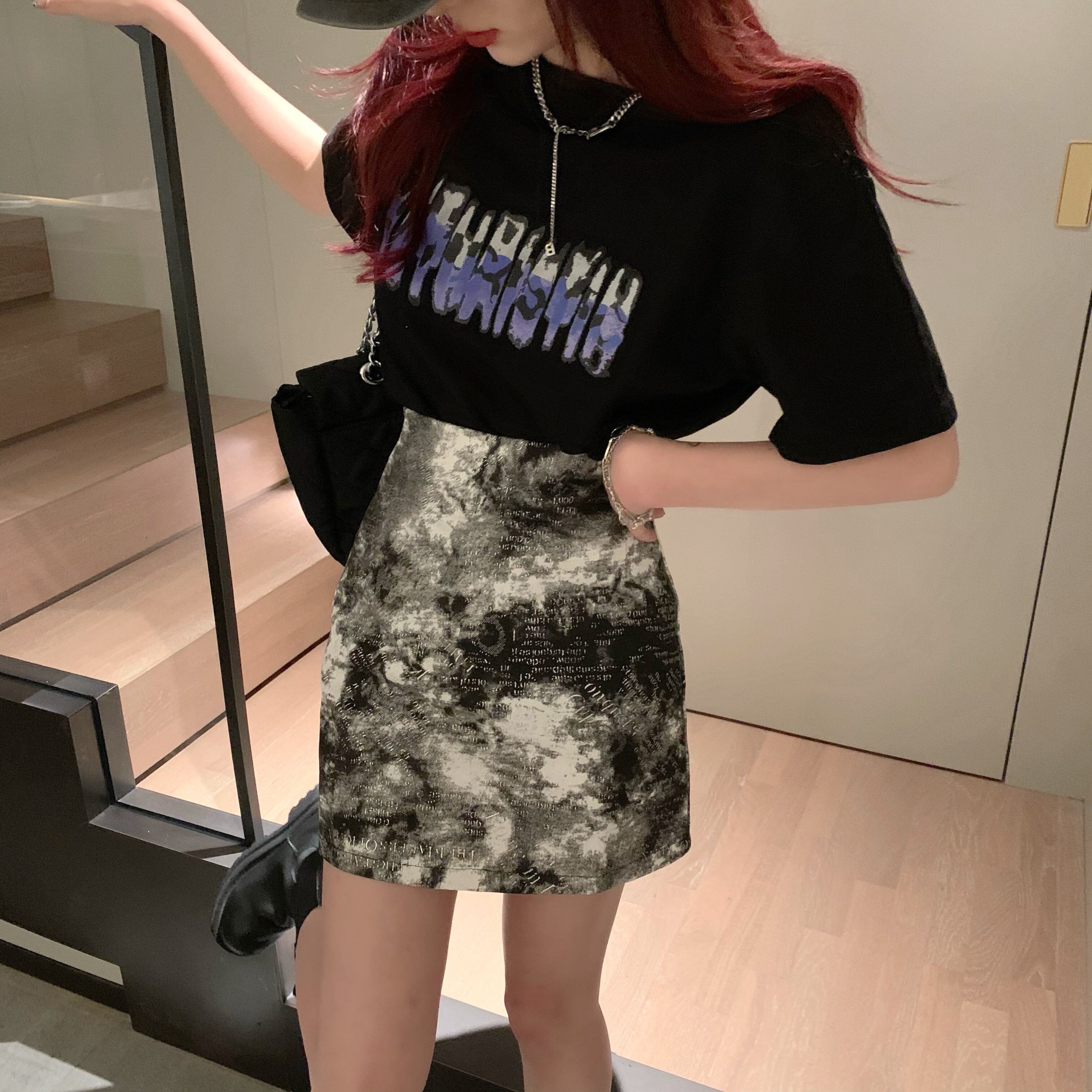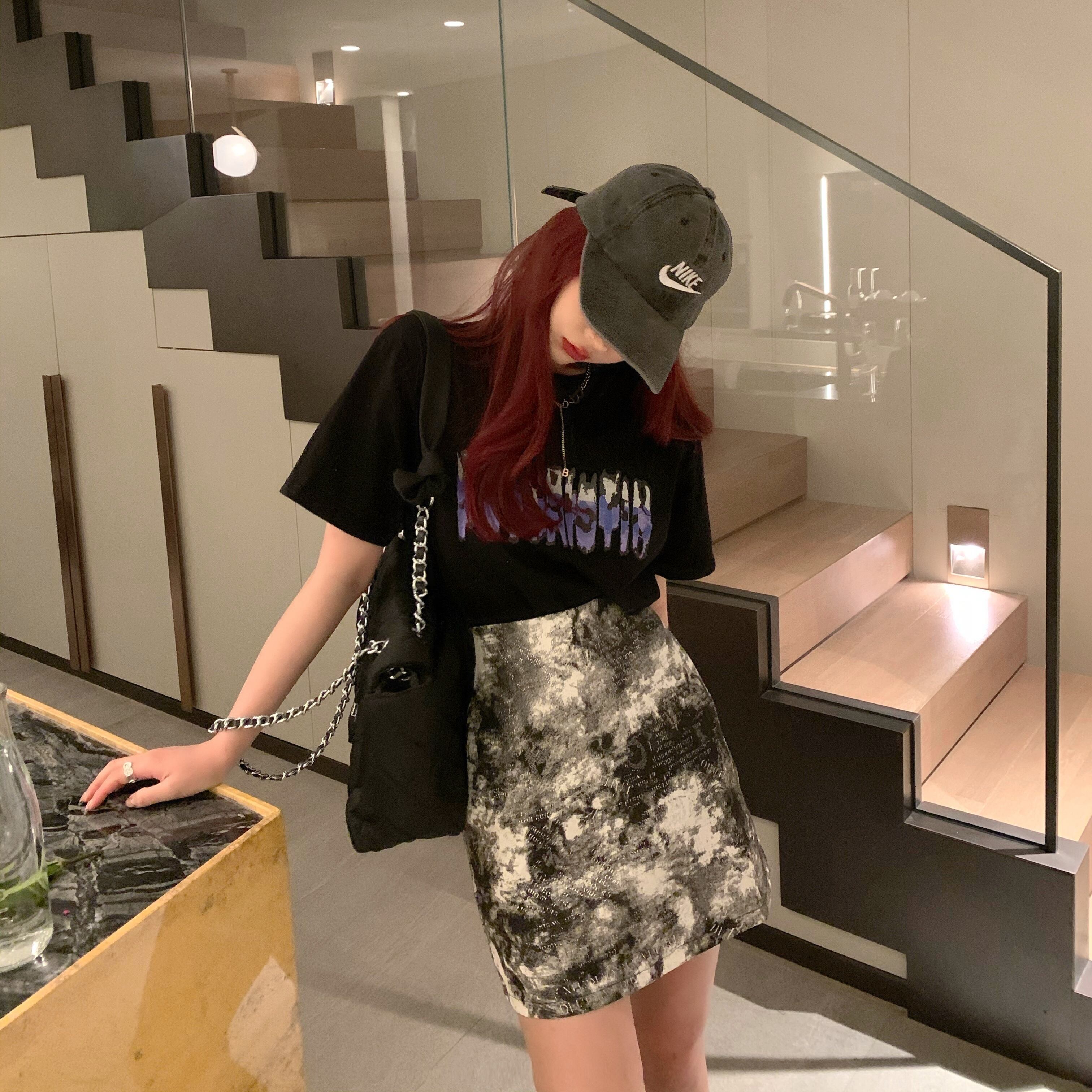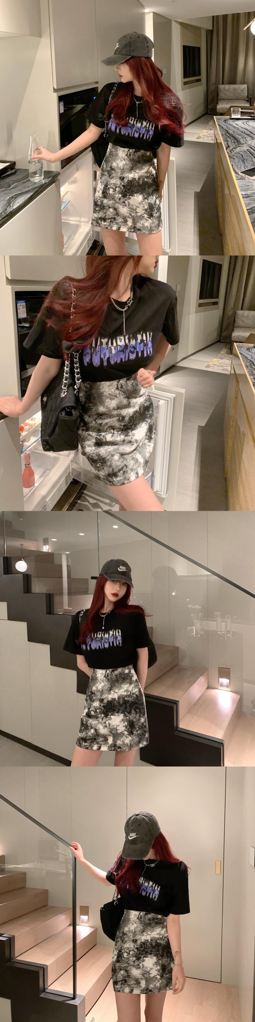 レッドプリントラウンドネックトップス ハイウェストウェストスリムスカート Oネック Xiaofeijia77444089091
