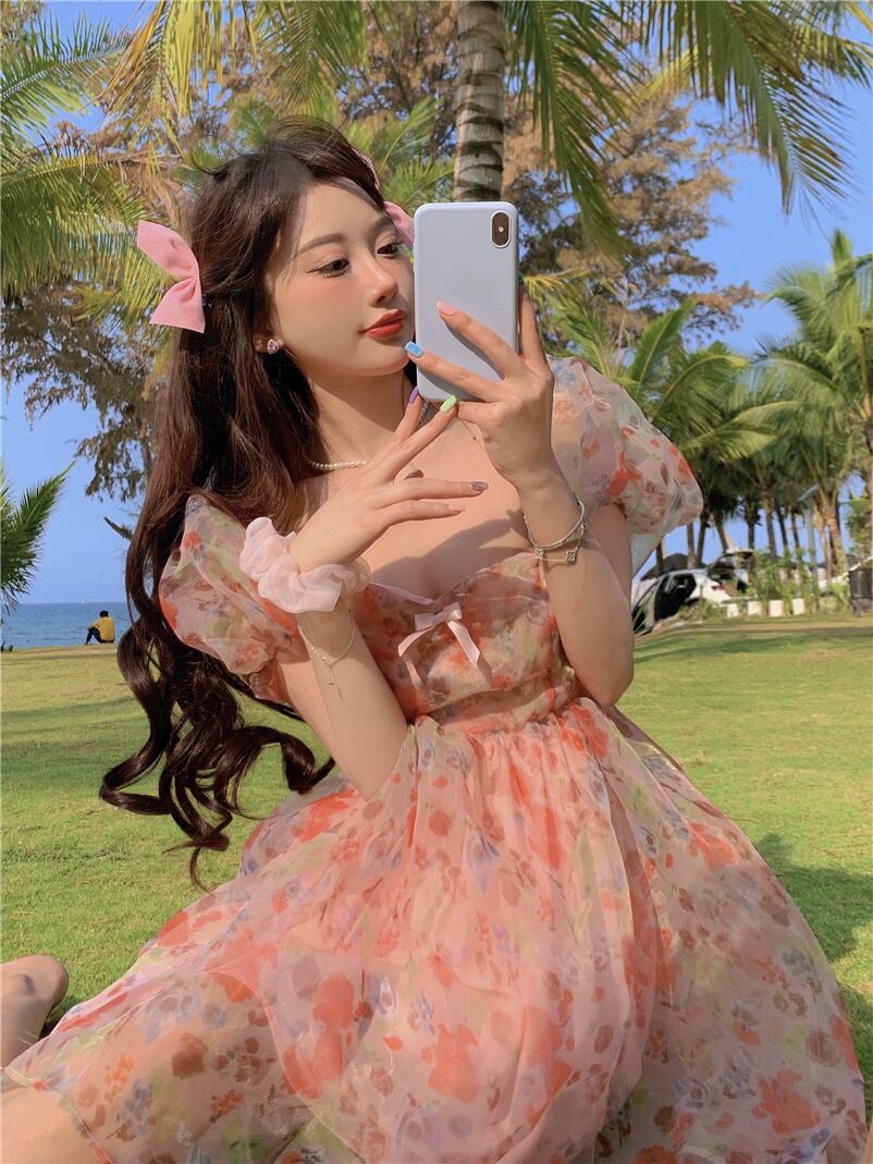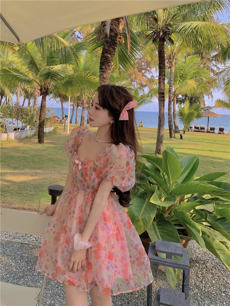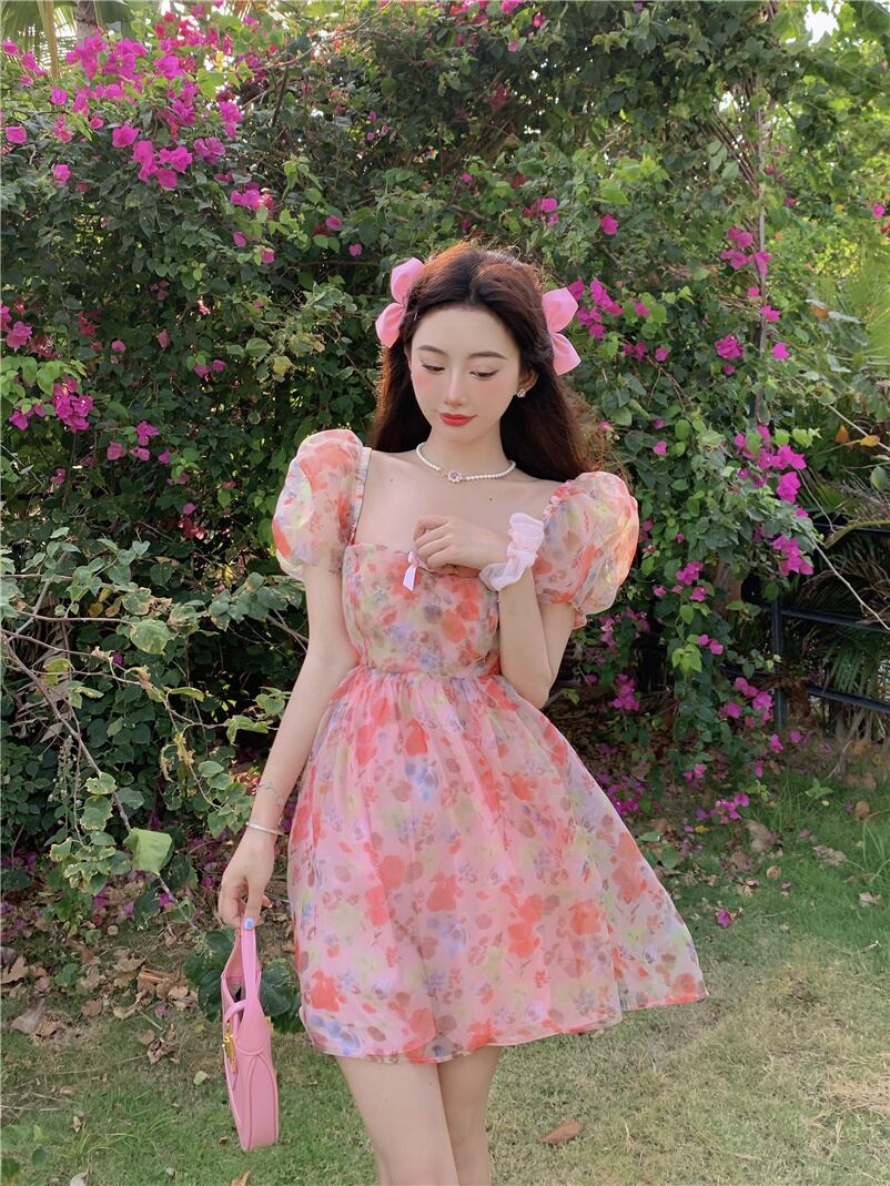 スプリングサマーフローラルスリーブドレス バックレススリム 春物 夏物 花柄 Xiaofeijia84421506031