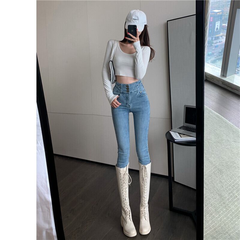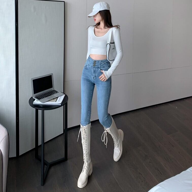 スプリングオータムスリムハイウェストウェストパンツ スキニージーンズ 春物 秋物 Xiaofeijia8626941260