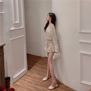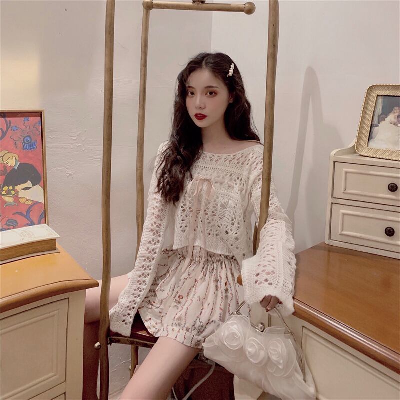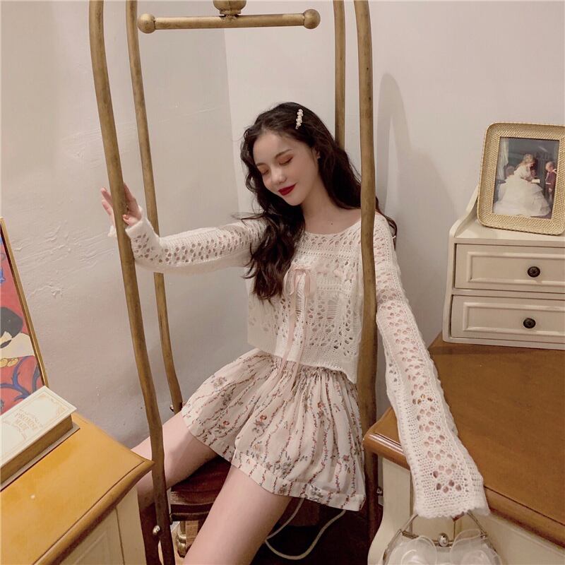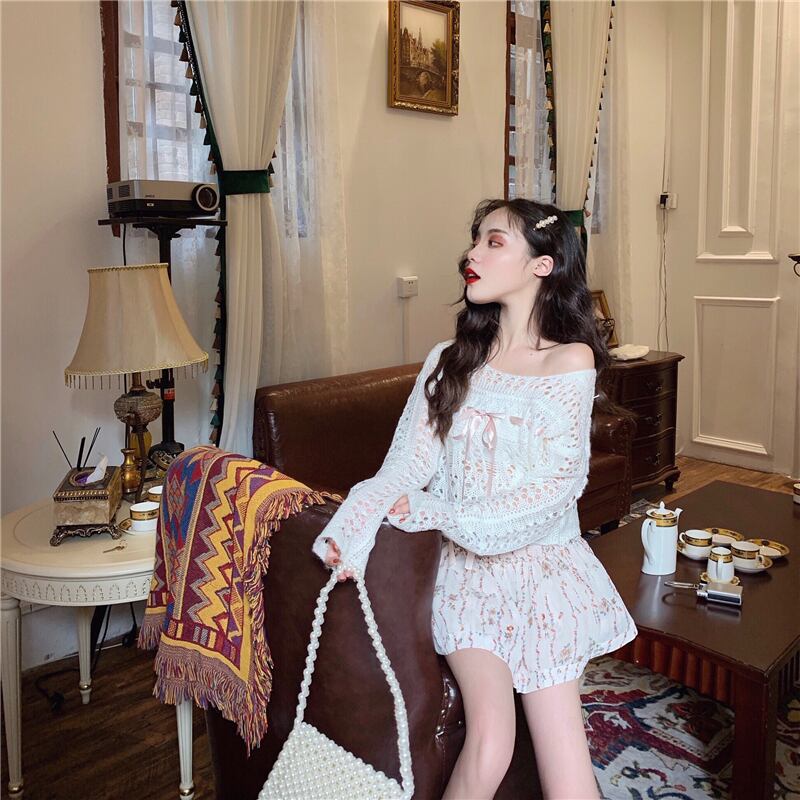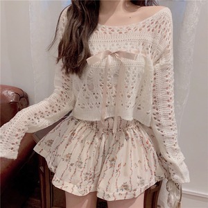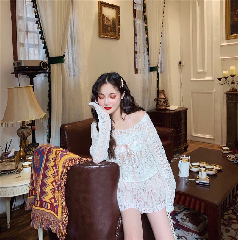 色:透かし編みセーター,フローラルショートスカート