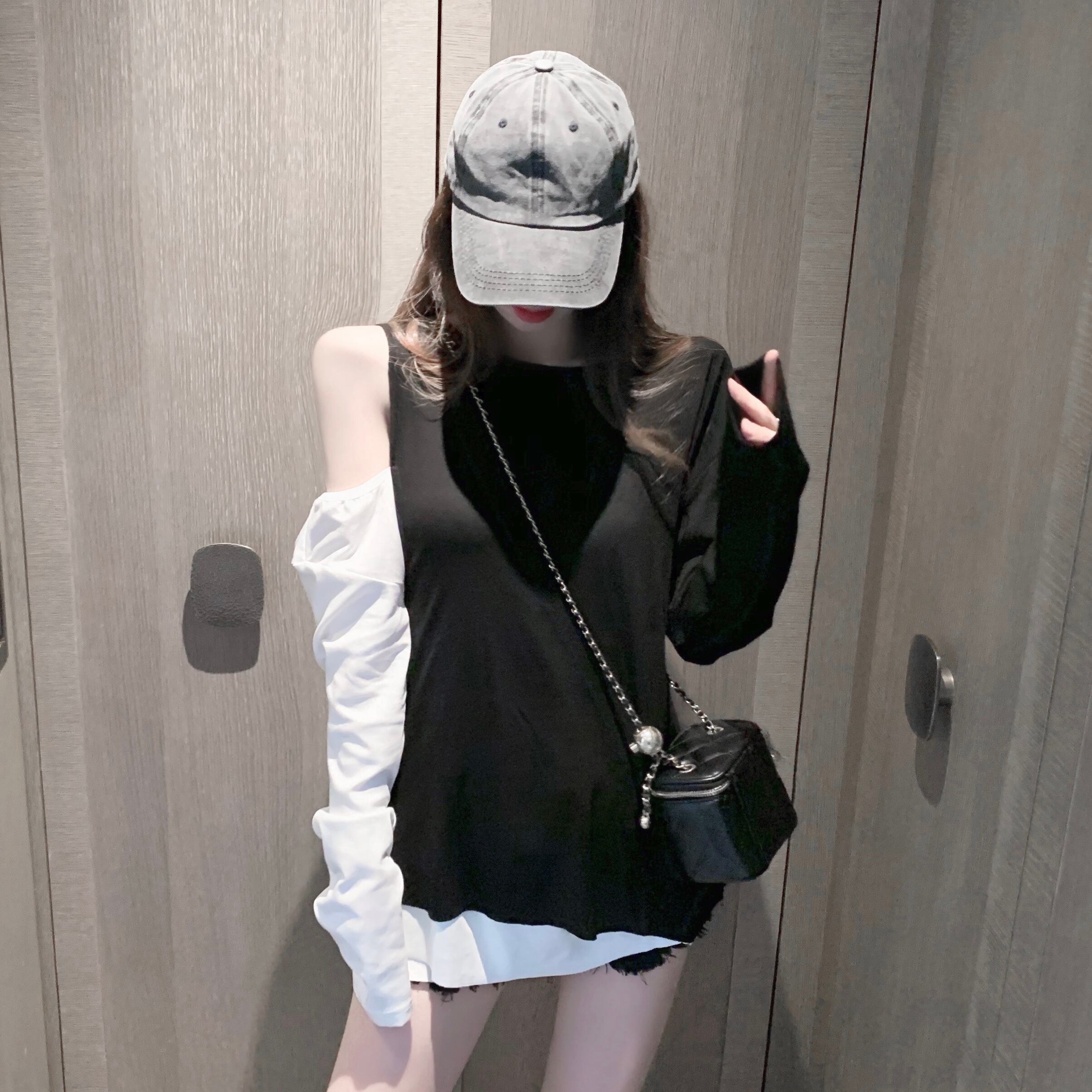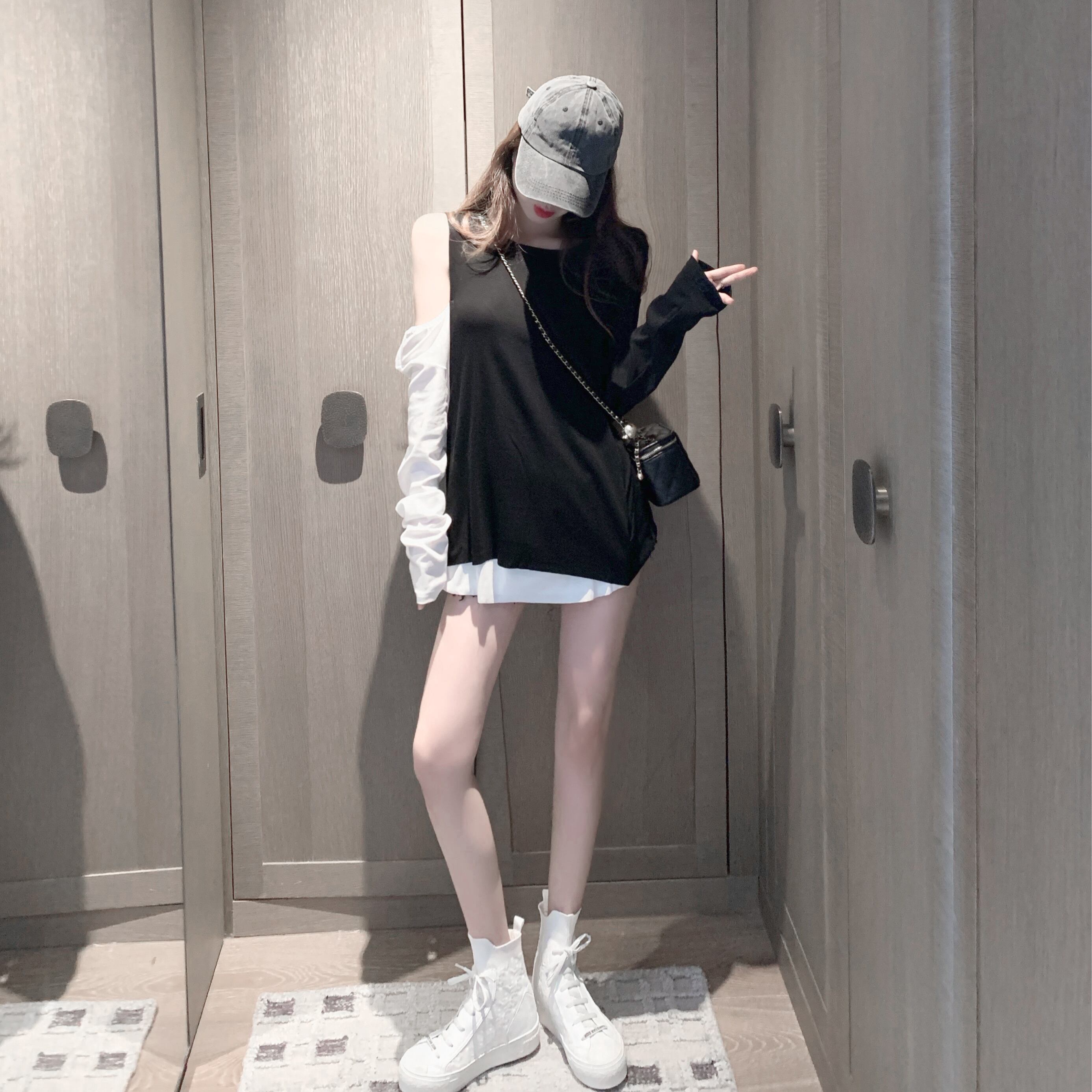 ルーズトップス レディースブラックホワイト ロング シャツ オフショルダー Tシャツ ステッチ Xiaofeijia44721788907