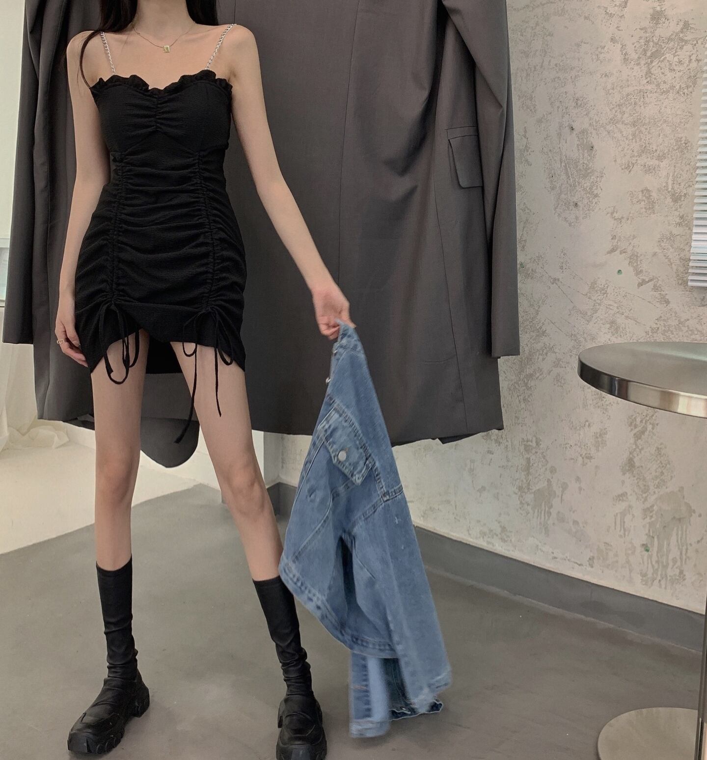 色:ブラックサスペンダースカート,白いドレス,青いコート,黒いジャケット