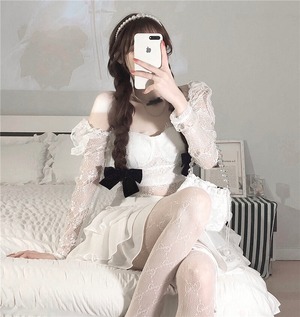 レース長袖スリーブ薄手トップス ウェストシフォンスカート ロング スクウェア Xiaofeijia24820602977
