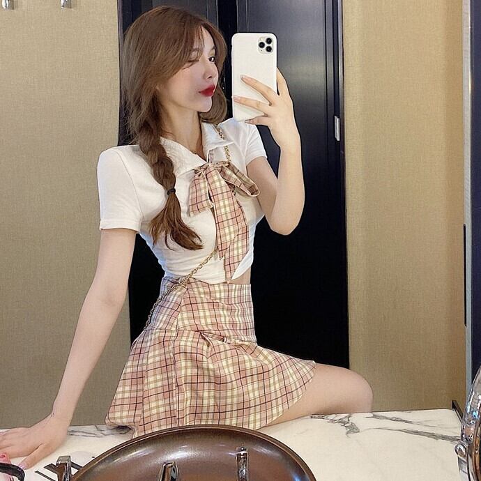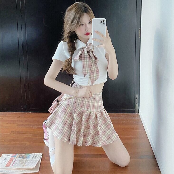 サマーショートリボンシャツ 格子柄プリーツスカート 夏物 Xiaofeijia94178260931