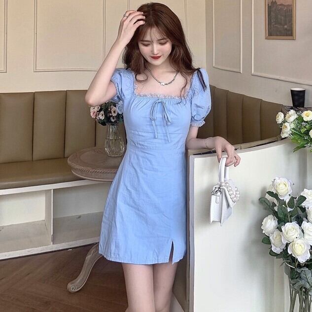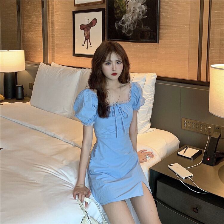 スプリングレースウェストドレス リボンスリット半袖スリーブスカート ショート ハーフスリーブ 春物 スクウェア Xiaofeijia1999389831