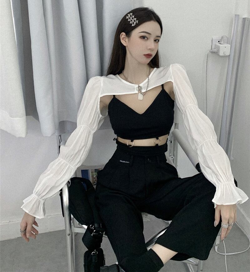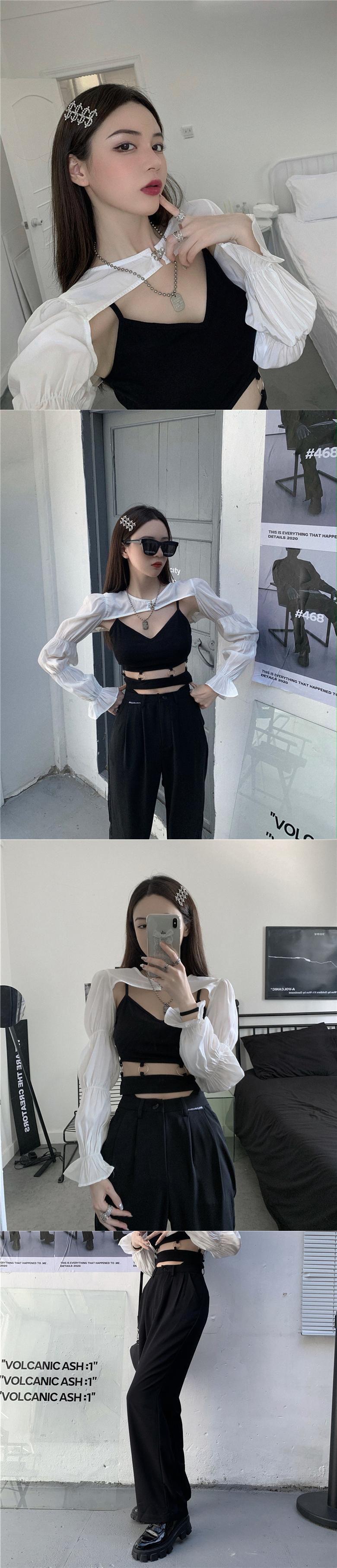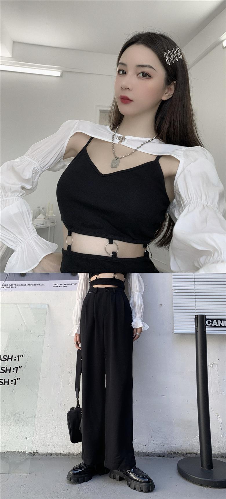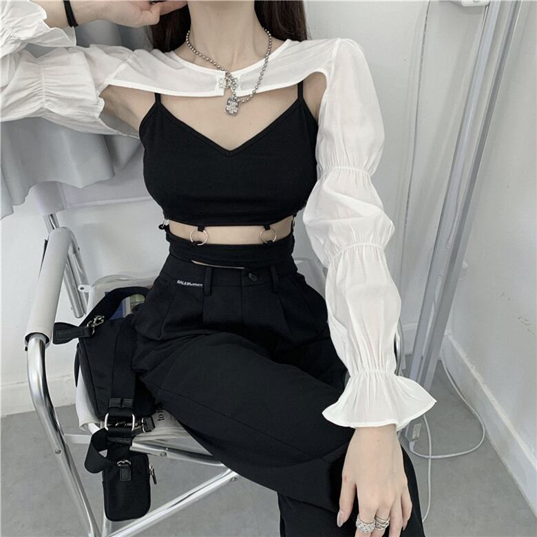 色:白いブラウス,ブラックサスペンダー,黒いズボン