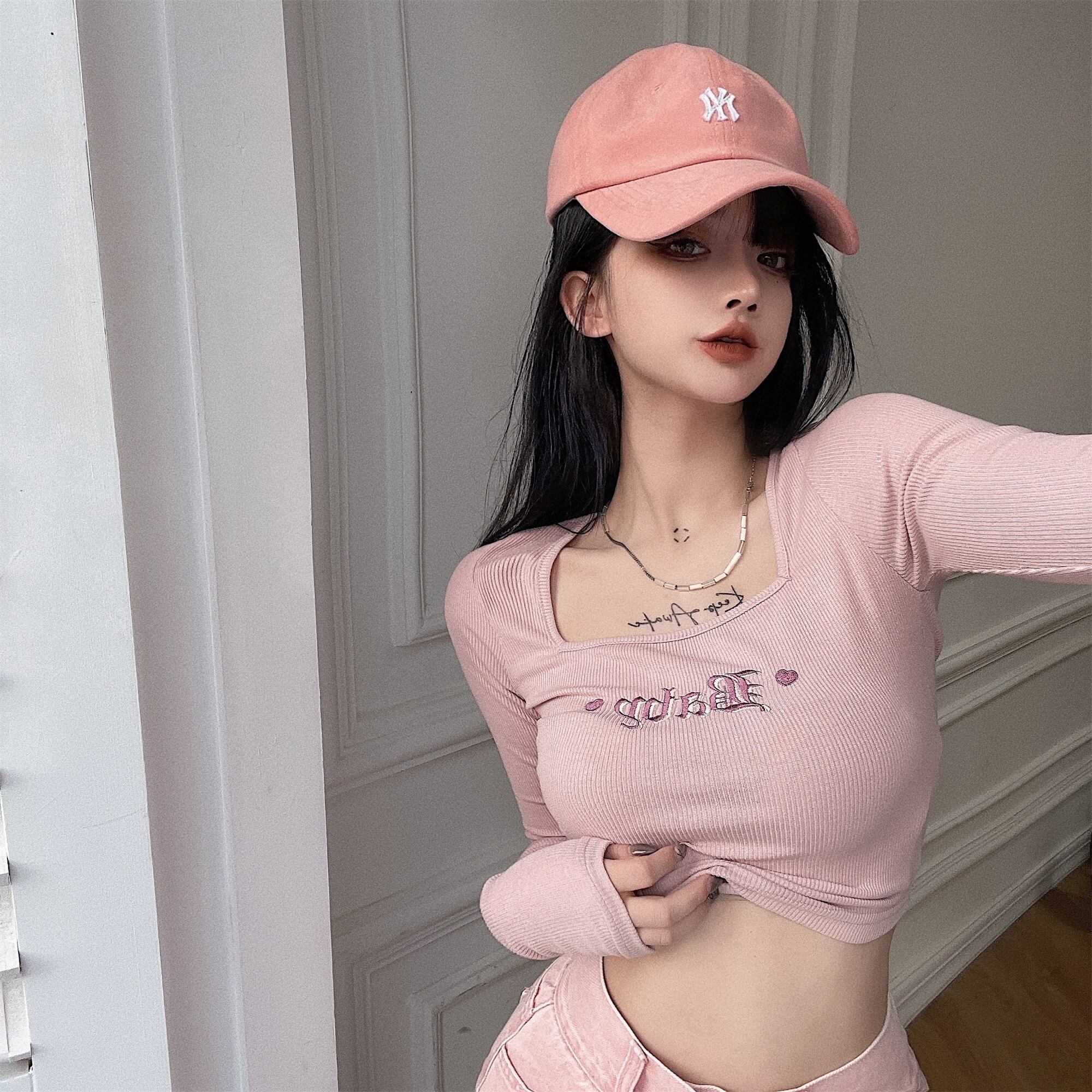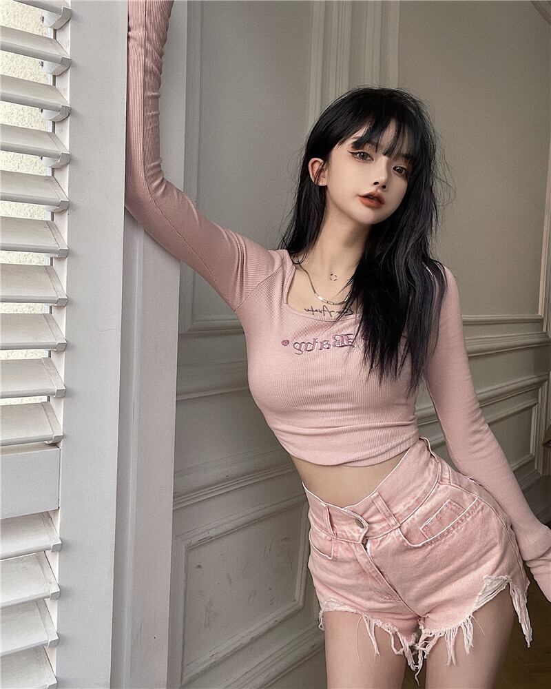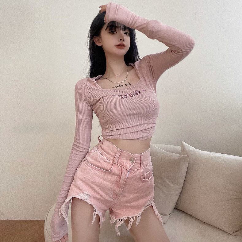 スプリングサマーハイウェストウェストショーツ 刺繍長袖スリーブTシャツ ロング ピンク 大人ガーリー スウィート キュート カジュアル 春物 夏物 ブルマー スクウェア Xiaofeijia52111146182