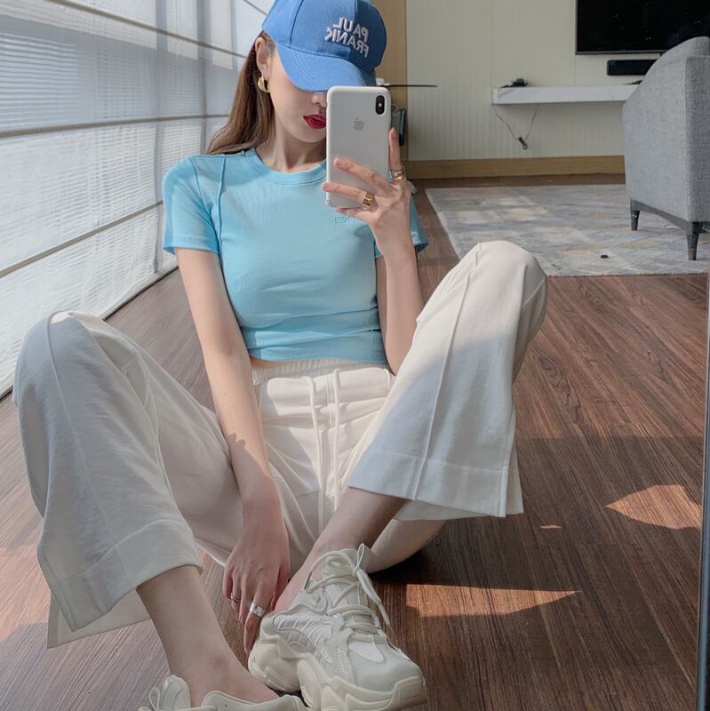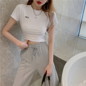 スプリングサマー刺繍ラウンドネックショートTシャツ ハイウェストウェストロングパンツ 春物 夏物 Oネック Xiaofeijia41443220463