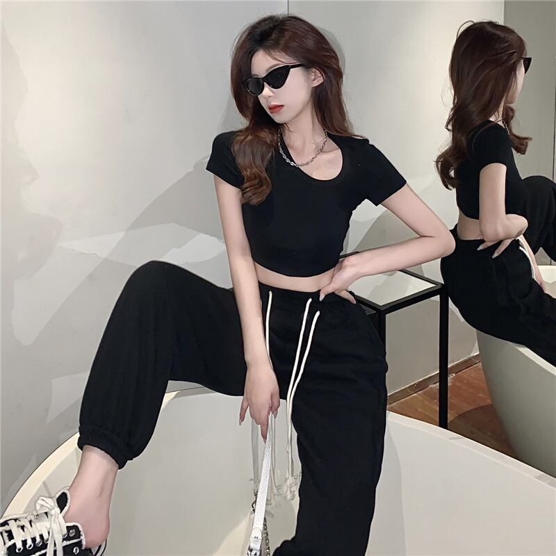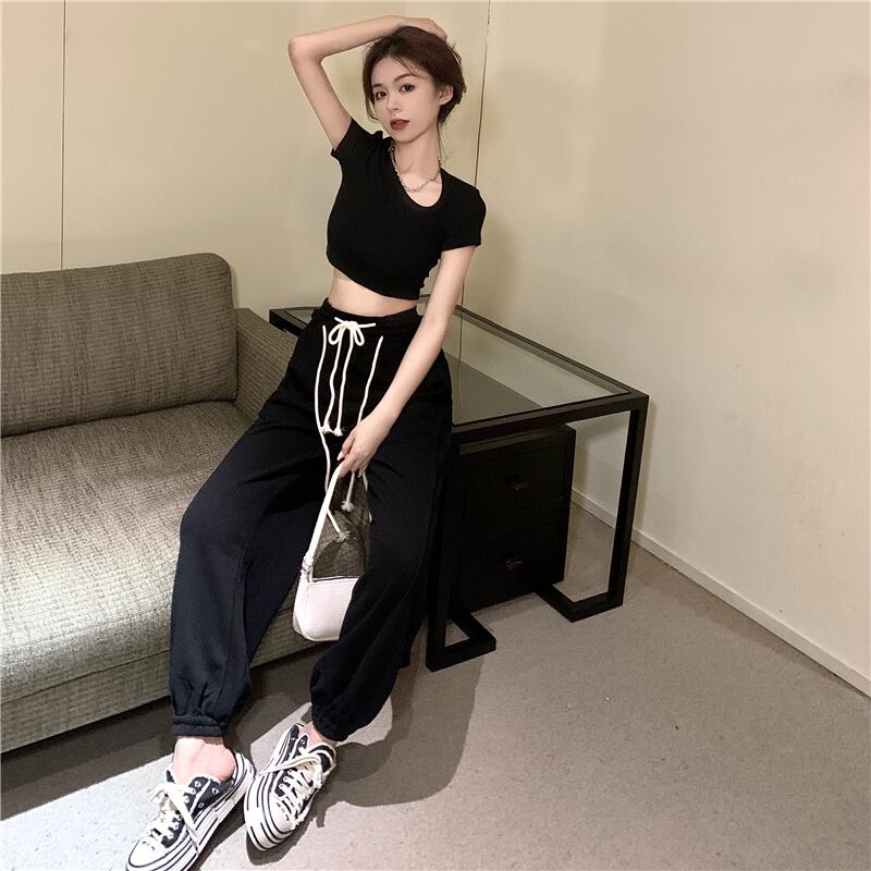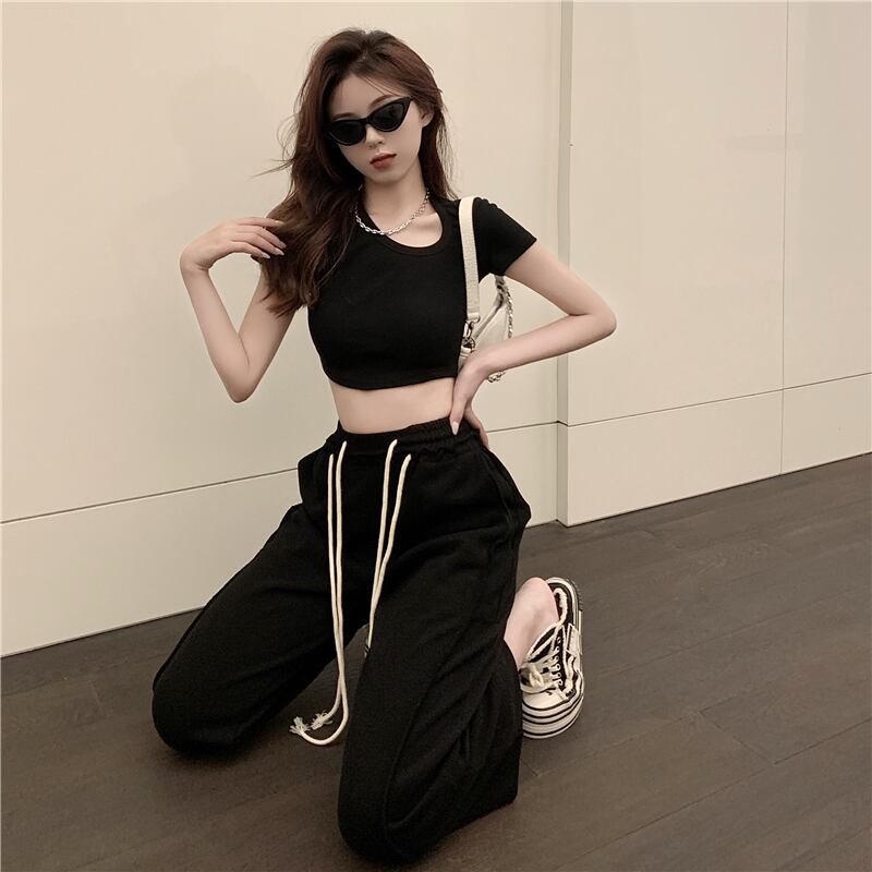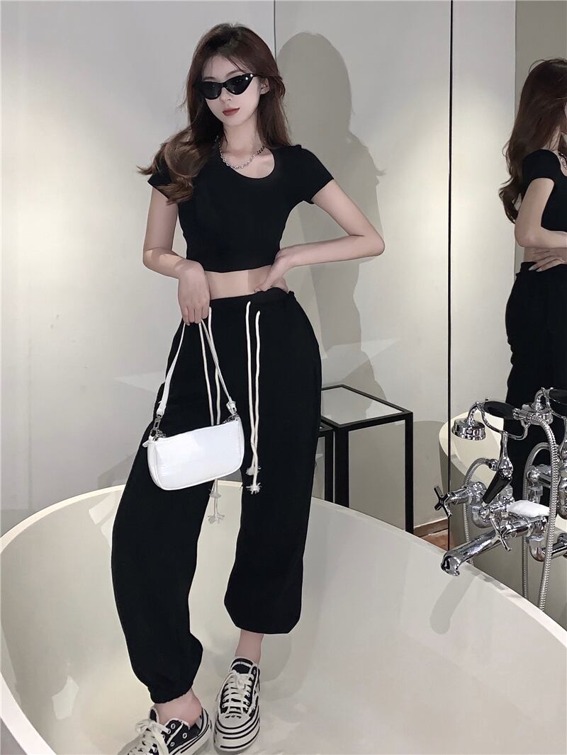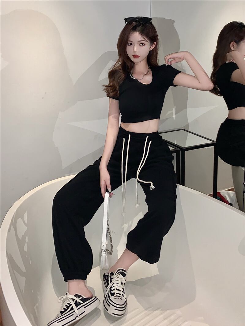 ブラックショートクロップトップ トップス 半袖スリーブTシャツ ギャザーパンツ ロング ハーフスリーブ Xiaofeijia42835334882