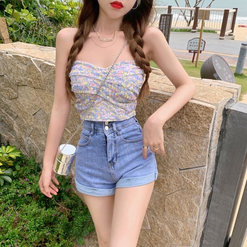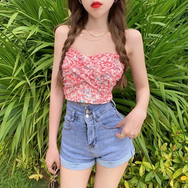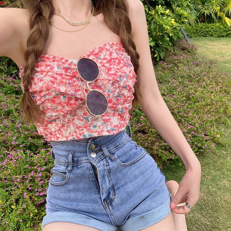 サマーフローラルトップス ショートクロップド 夏物 花柄 Xiaofeijia22322855895