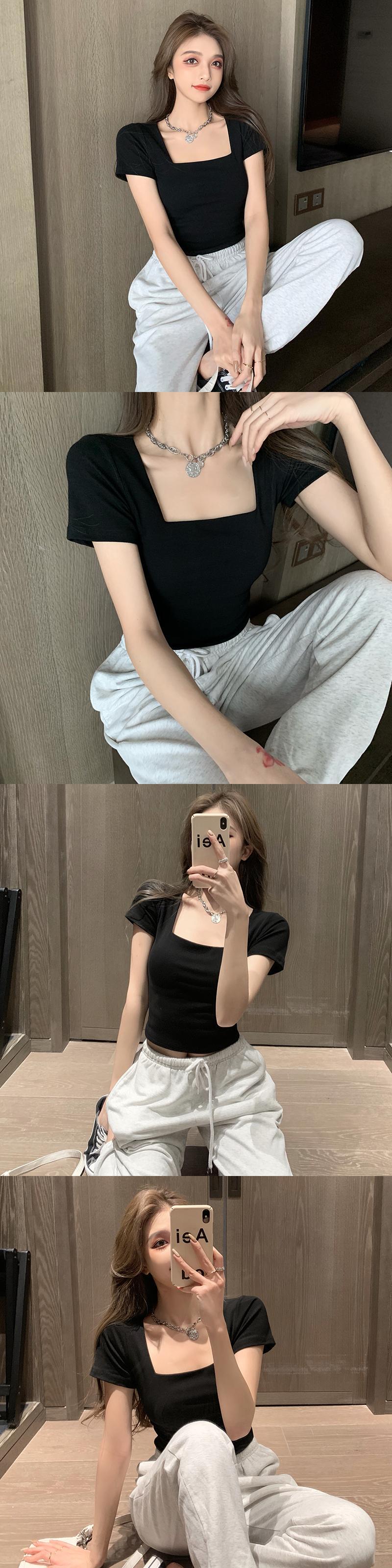 スプリングサマーショートTシャツ レディーススタンダードカラー半袖スリーブスリムトップス レトロ ハーフスリーブ 春物 夏物 スクウェア Xiaofeijia18665022906
