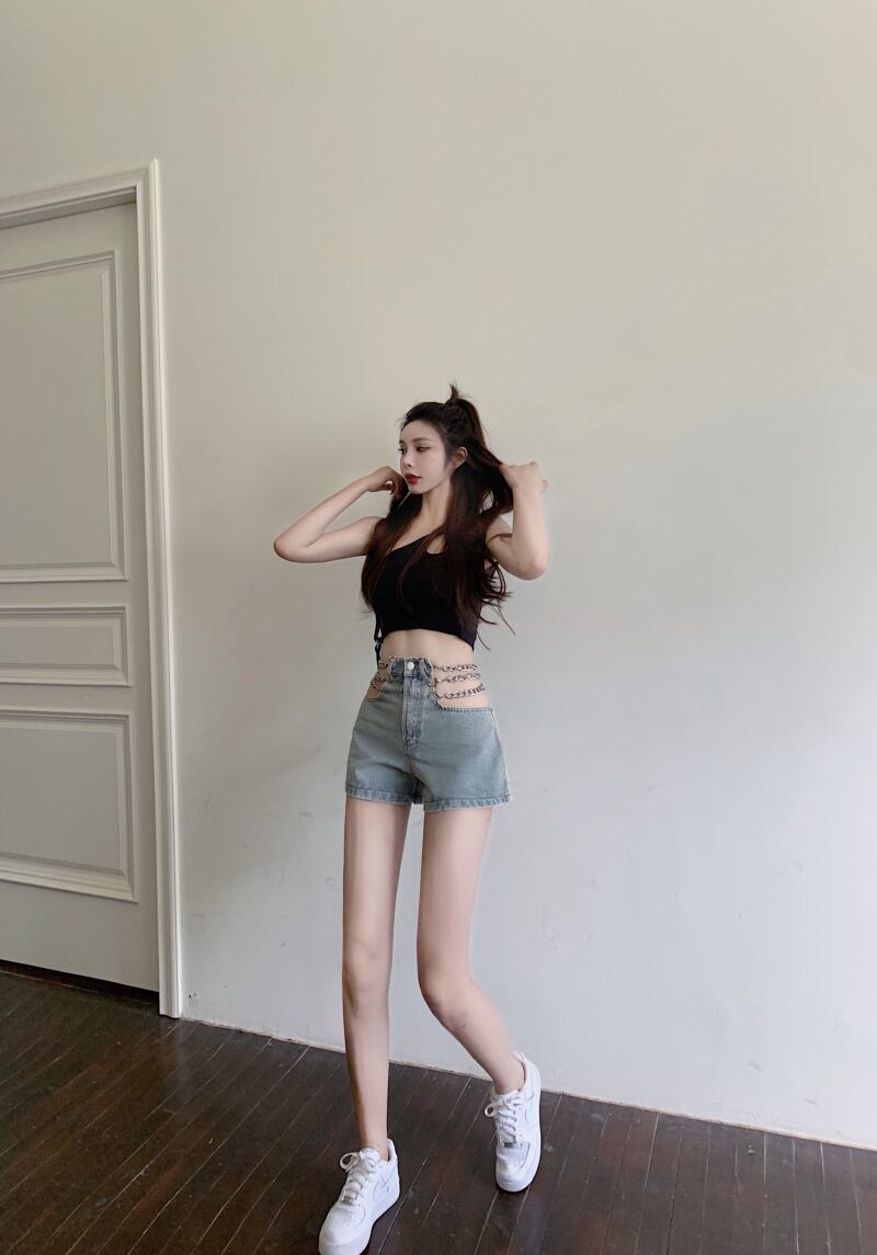 パンツ サマーウェストチェーン ジーンズ ショーツ ハイウェストワイドレッグ 夏物 ブルマー ワイドパンツ Xiaofeijia74809491169